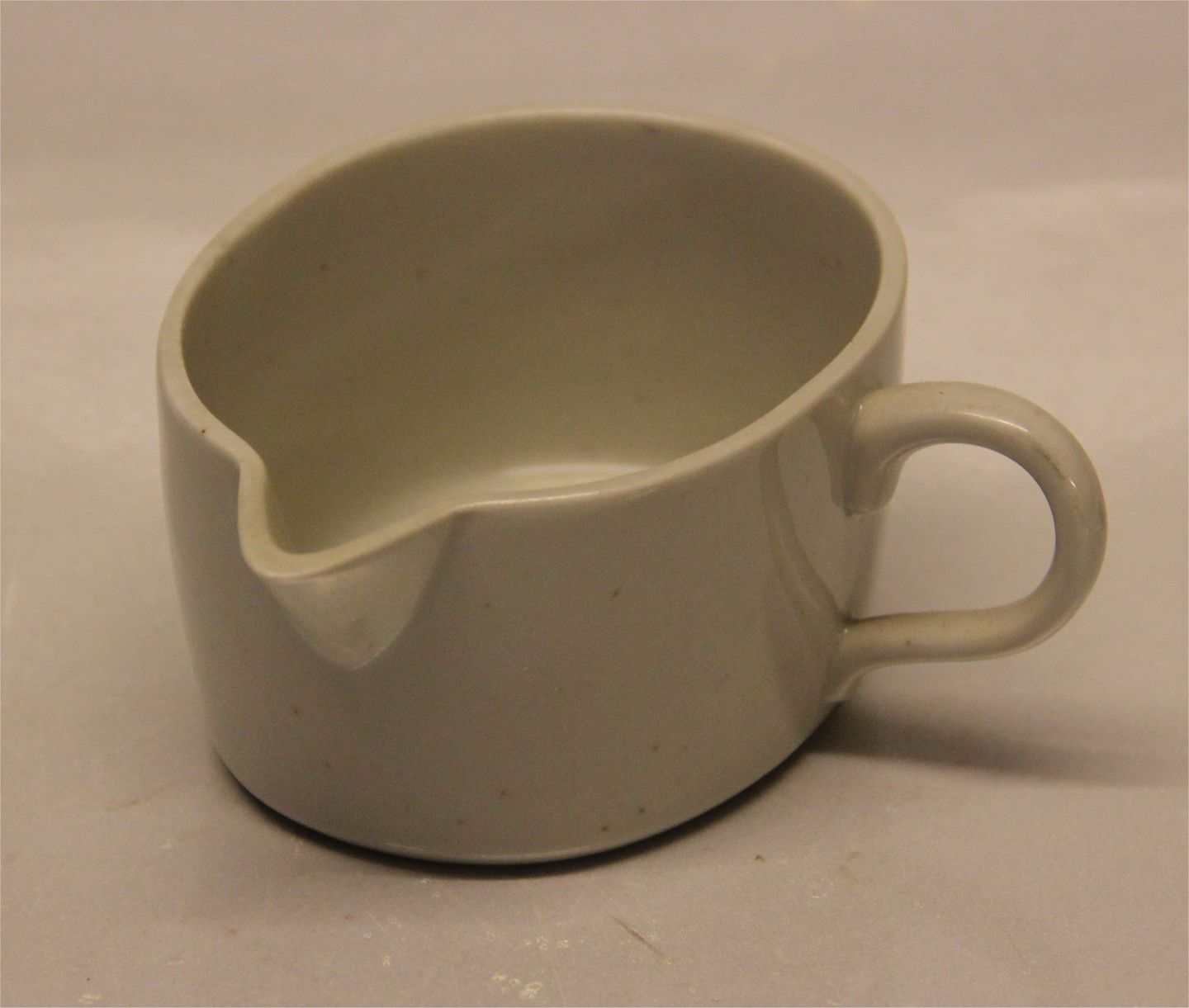 14956 Flødekande 4.7 x 10 x 11 cm Kgl.Capella - Gråt stel med rustik glasur og kulpletter fra brændingen. Det var Gertruds ønske at det skulle fremstå råt og forskelligt. Hun blev rassende da sorteringmesteren mærkede dem hun så som perfekte som 2. sortering. Udsendt i en gennemsnits sortering. Cappella Design Gertrud Vasegaard for Royal Copenhagen I fin og hel stand