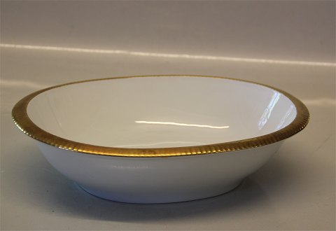 012 b Oval kartoffelskål 24,5 cm (573) Golden Sun - Gylden Sol. Form 674 er formgivet af Sigward Bernadotte. Denne form findes i hvidt, med bred guldkant (Gylden Sol), med smal guldbelægning på inderkanten (Vega), med grønt og guld (Perseus), med rødt og guld (Herkules) og beige og guld (Norma).