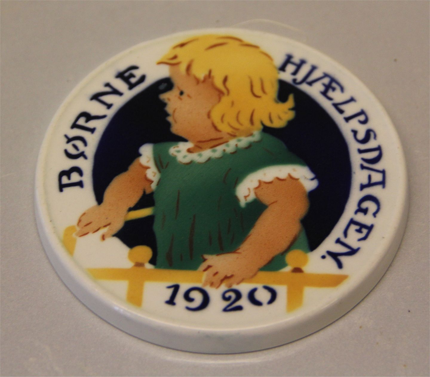 Royal Copenhagen Aluminia fajance Børnehjælpsplatte 1920 Barn i kravlegård Oscar Willerup 8,7 cm