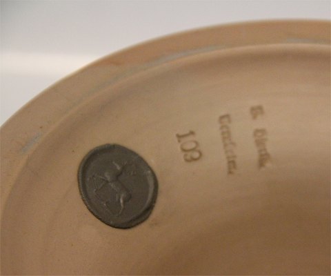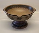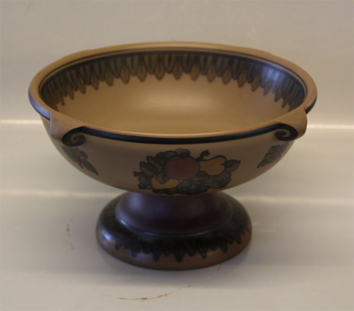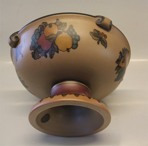 Bornholm, L. Hjort Keramik L.Hjorth: Stor brun skål på fod - dekoreret med frugt 16 x 27 cm #103