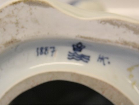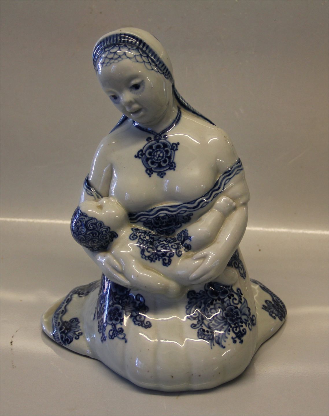 Beskrivelse: Kgl. figur fra Royal Copenhagen 1887 Kgl. Mor med barn. Dekoret med musselmalet blå over glasuren i grå 26.5 x 20 cm Signeret HC Holger Christensen? Mærket med Juliane Marie mærket. Lidt støvstænk men ellers i hel og fin stand