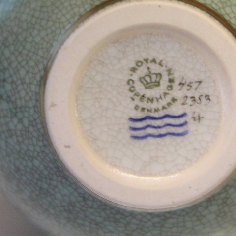 Beskrivelse: 457-2353 Kgl. Grøn vase med gråt og guld 10.5 cm Craquelé fra Royal Copenhagen I hel og fin stand