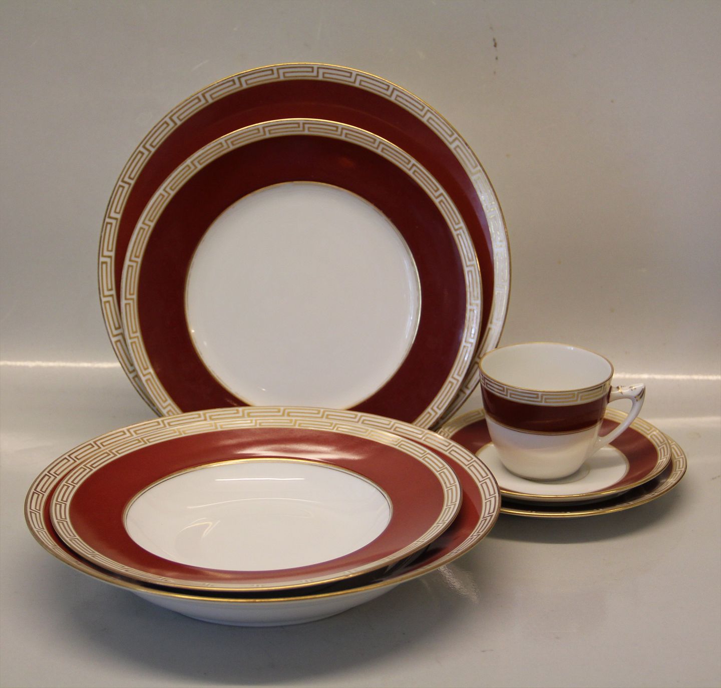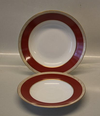 Beskrivelse: Wagner B&G Rustrød fond, åben guld à la grecque bort og guldkant, hvid