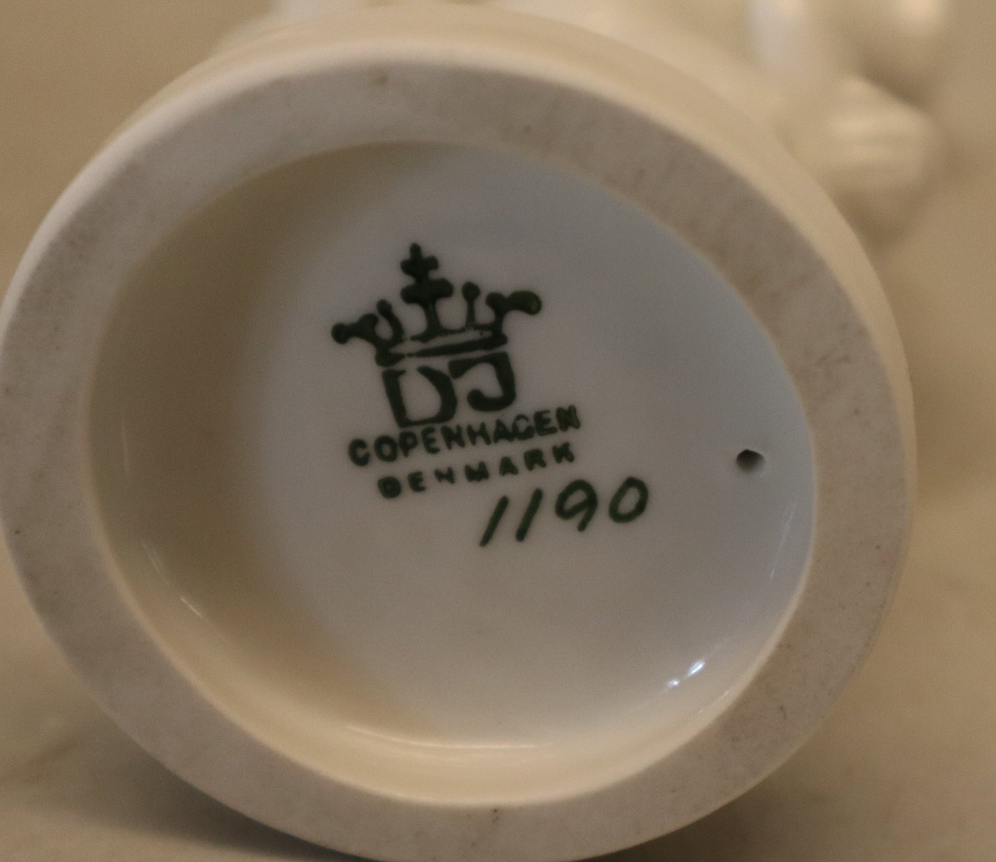 Beskrivelse: Dahl Jensen hvid 1190 Bager (DJ) 13,5 cm, hvid Blanc de Chine. Mærket med kongelig krone og DJ Copenhagen i hel og fin stand.