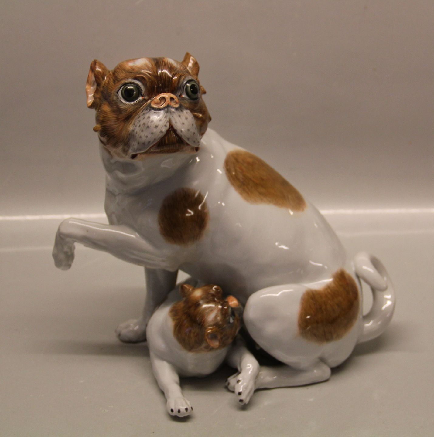 Beskrivelse: Bulldog med hvalp 24 x 26 'Carl Thieme Meissen Sächishe Porzellanfabrik 'Potschappel Dredsen