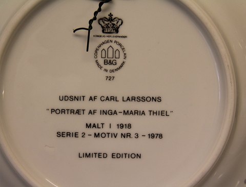Bing & Grøndahl Carl Larson B&G 8727 1978 Carl Larssons platte - serie 2 - motiv nr. 3 "Portræt af Inga-Marie Thiel" Malt i 1918, 21,5 cm