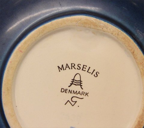 Beskrivelse: Royal Copenhagen Aluminia fajance 2638 Marselis blå skål 11,5 x 2.5 cm, rund med radiære striber, 1953