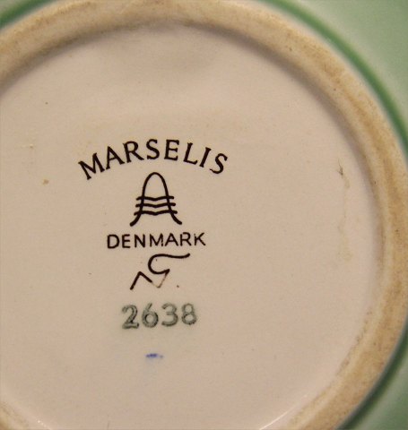Beskrivelse: Royal Copenhagen Aluminia fajance 2638 Marselis grøn skål 11,5 x 2.5 cm, rundet med radiære striber, 1953
