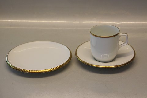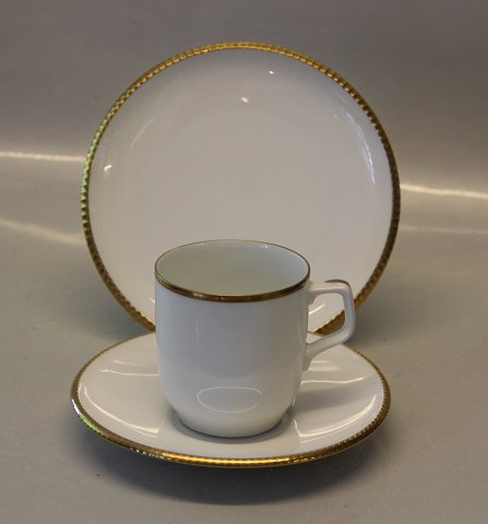 102 Kaffekop 7 x 6.7 cm og underkop 14 cm1,25 dl (305) Golden Sun - Gylden Sol. Form 674 er formgivet af Sigward Bernadotte. Denne form findes i hvidt, med bred guldkant (Gylden Sol), med smal guldbelægning på inderkanten (Vega), med grønt og guld (Perseus), med rødt og guld (Herkules) og beige og guld (Norma).