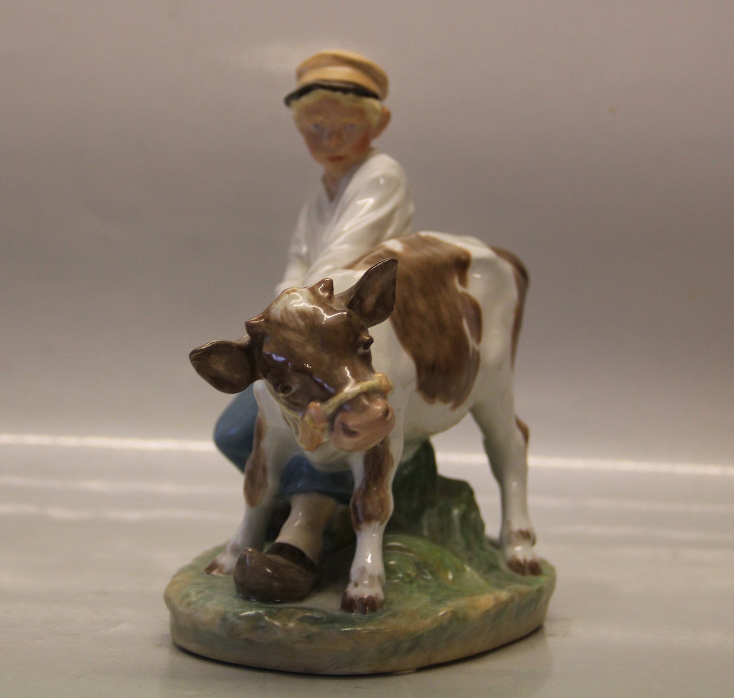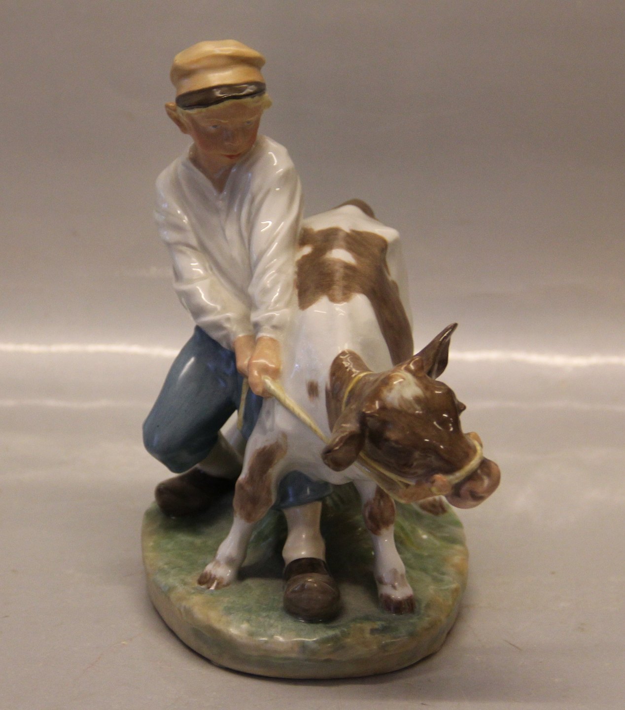 Beskrivelse: Kgl. figur 0772 Kgl. Dreng med kalv Chr. T. 1906 6.5" overglasur dekoreret fra Royal Copenhagen I hel og fin stand