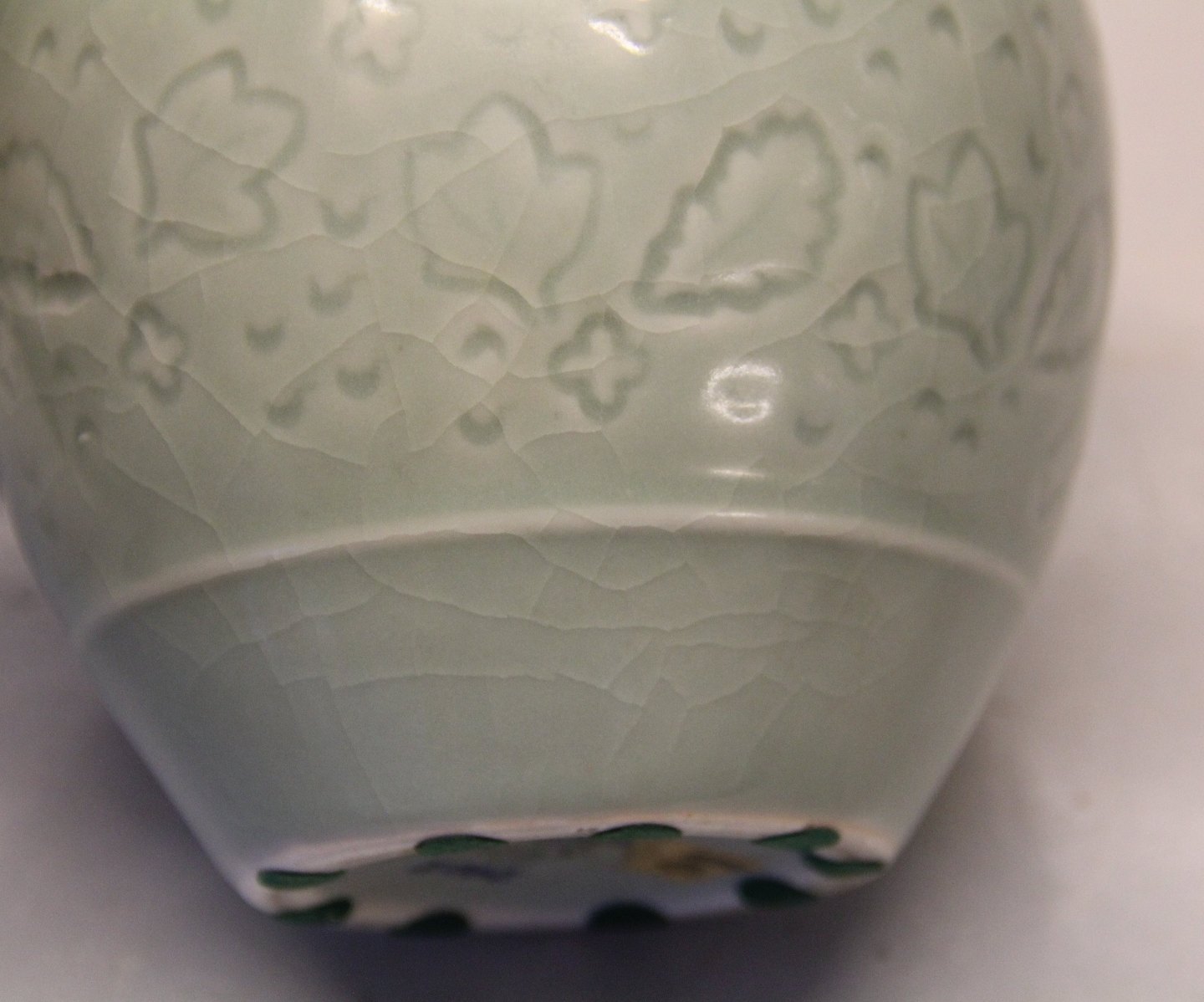 Kongelig Dansk Stentøj 2902 Kgl. Grøn Krakkeleret Celadon med egeblade i relief 18 cm signeret HHH
