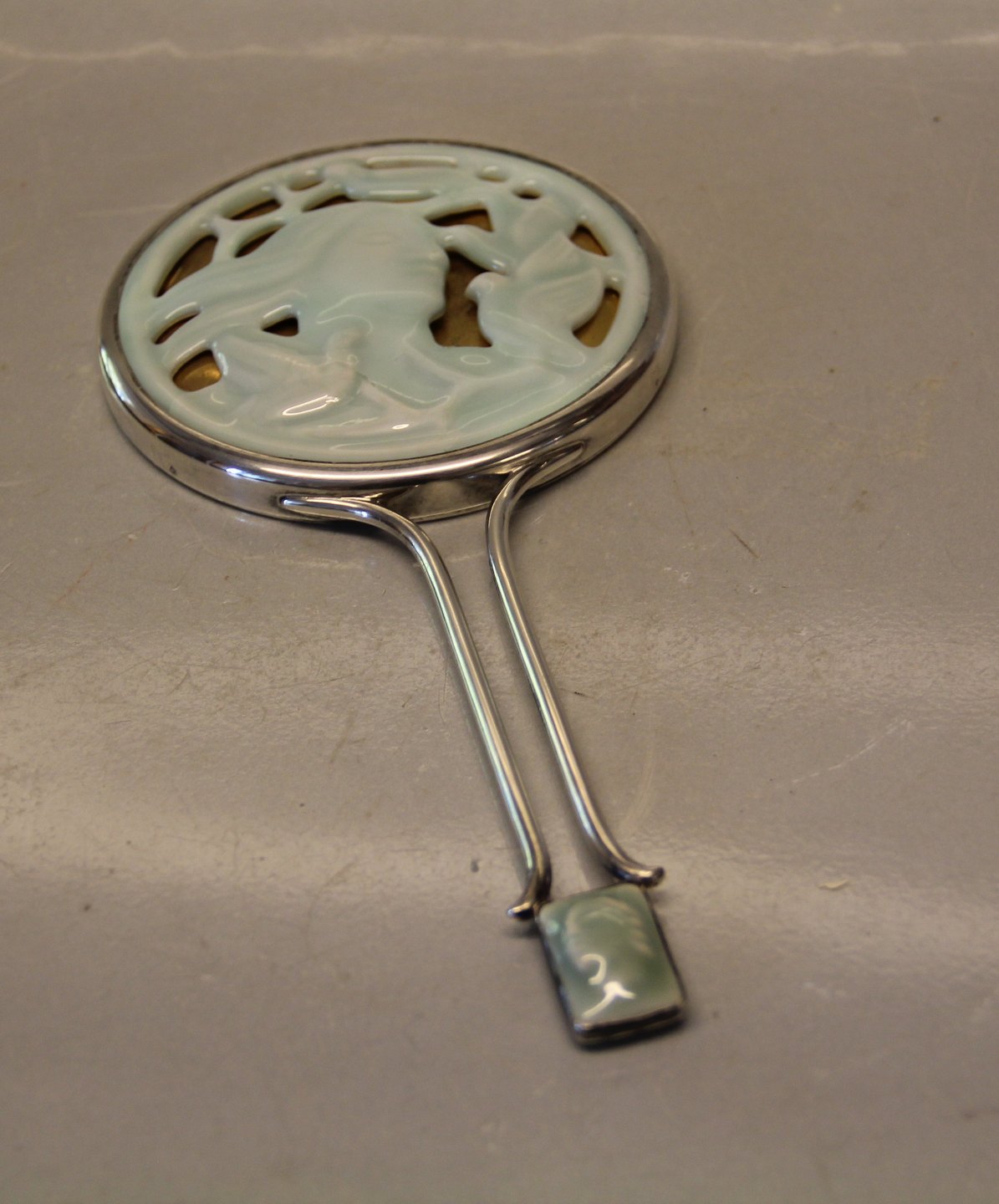 Kongelig Dansk Kgl. Jais Nielsen håndspejl med celadon stentøj - ansigt med duer 25 cm Sølv AD 826 S