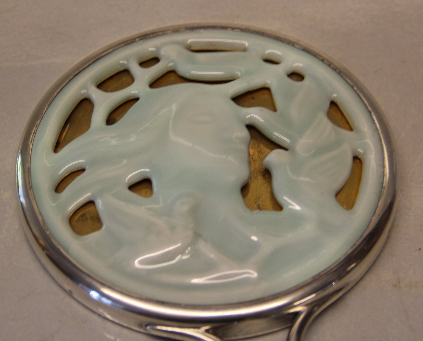 Beskrivelse: Kgl. fra Royal Copenhagen Kgl. Jais Nielsen håndspejl med celadon stentøj - ansigt med duer 25 cm Sølv AD 826 S
