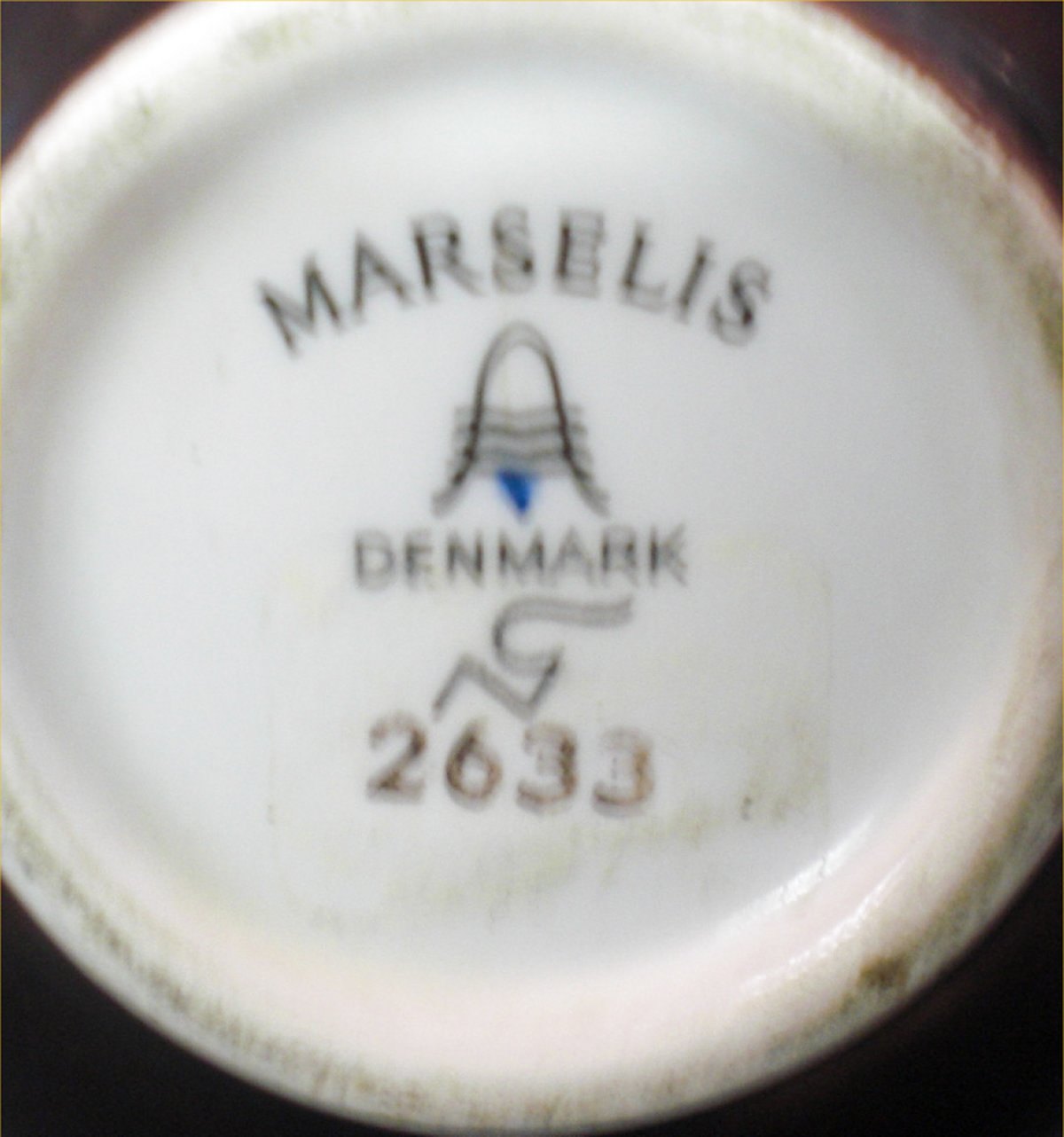 Beskrivelse: Royal Copenhagen Aluminia fajance 2633 Marselis Brun Vase, pæreformet med små ovaler 13 cm Nils Thorsson 1953