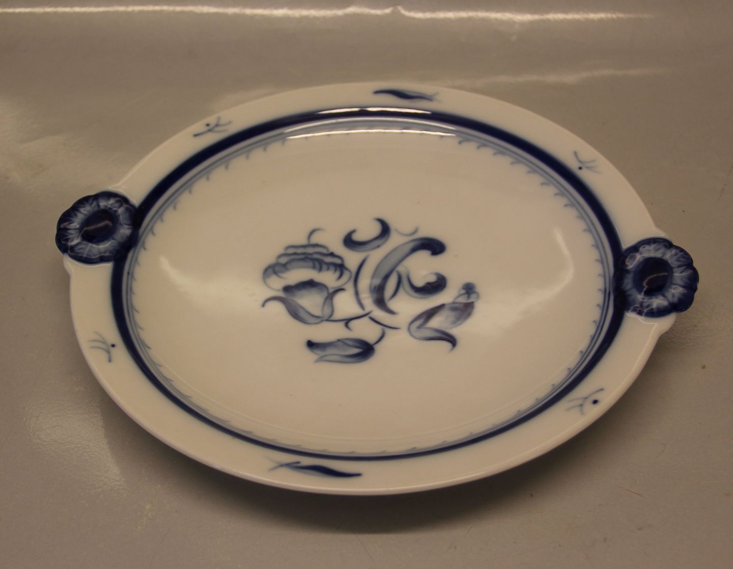 Beskrivelse: 101 Fad med hank 26,5 cm (304) Bing & Grøndahl Jubilæumsstellet: Blå nellike, hvid, underglasur, form 595