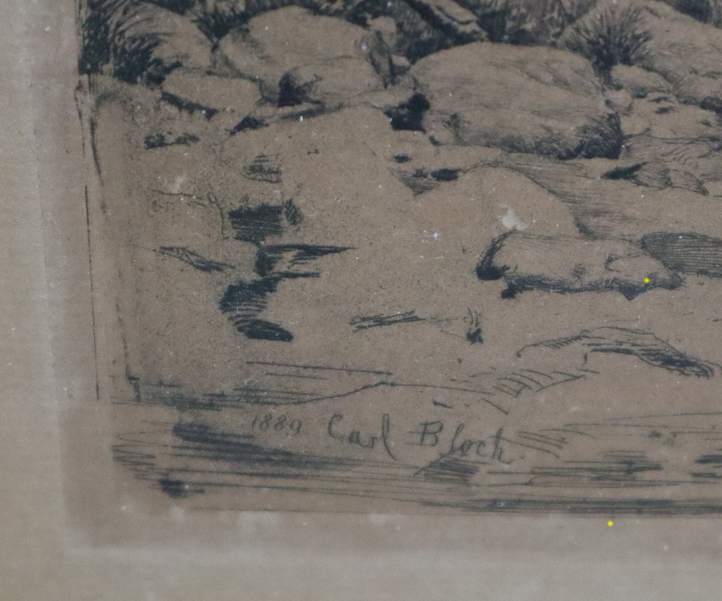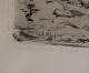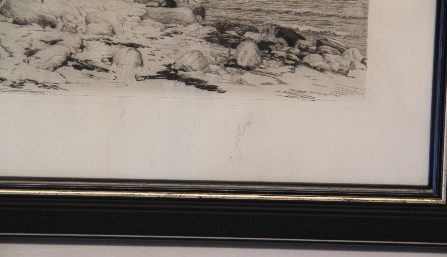 Beskrivelse: Carl Bloch Radering af kystlandskab 1889 29 x 40 cm iinklusiv gl. sort træramme - mindre skader i papiret