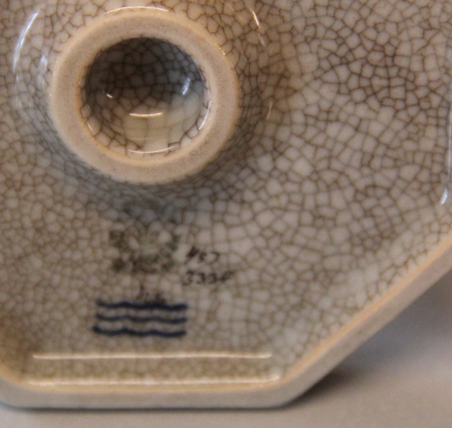 Beskrivelse: 457-3334 Kgl. Lysestage grøn, grå og guld  5.5 x 9.8 cm Craquelé fra Royal Copenhagen I hel og fin stand