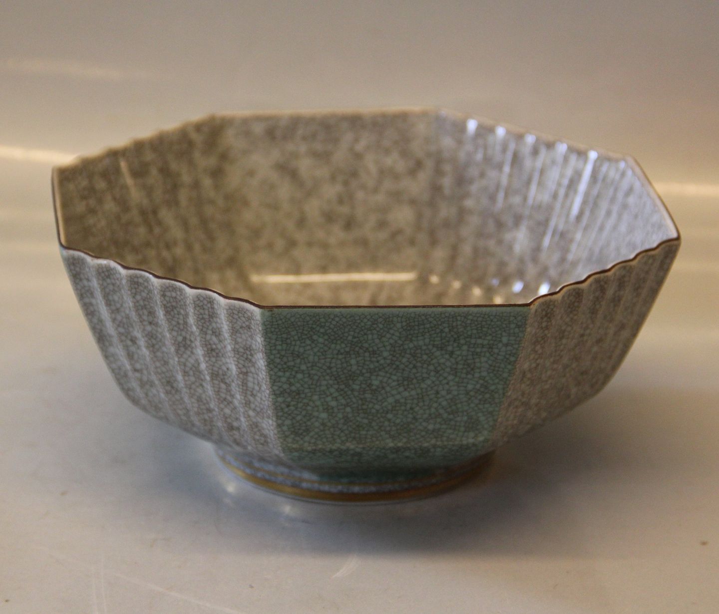 Kongelig Dansk 457-3419 Kgl. Ottekantet grøn og grå skål 7.5 x 17 cmCraquelé, Craquele