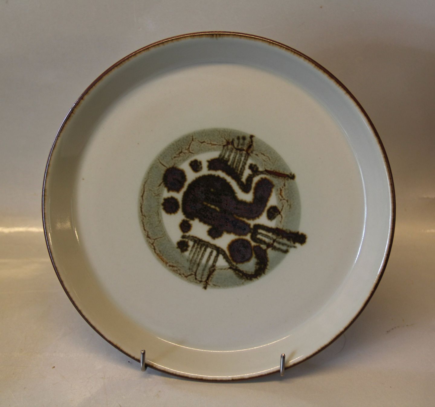 Middagstallerken 23 cm Thule fra Desire: Rødbrune fjelde, isgrønt hav, sagn og eskimotegn har inspireret til stellet Thule. Ved fremstillingen er der lagt vægt på brugsegenskaberne, hvor Thule gennem en særlig hærdning i brændingen er gjort meget stærkt i brug.