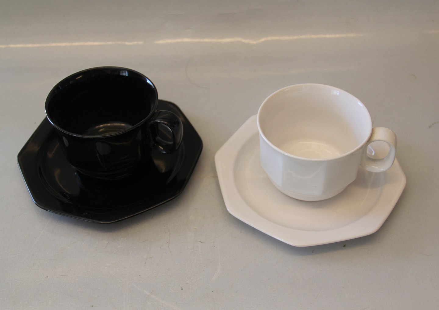 Café Dansk Stentøjstel kantet hvid og sort Kafe B&G Form 850 Sort 475 Kop 6,5 cm ottekantet underkop 15,5 cm, hvid