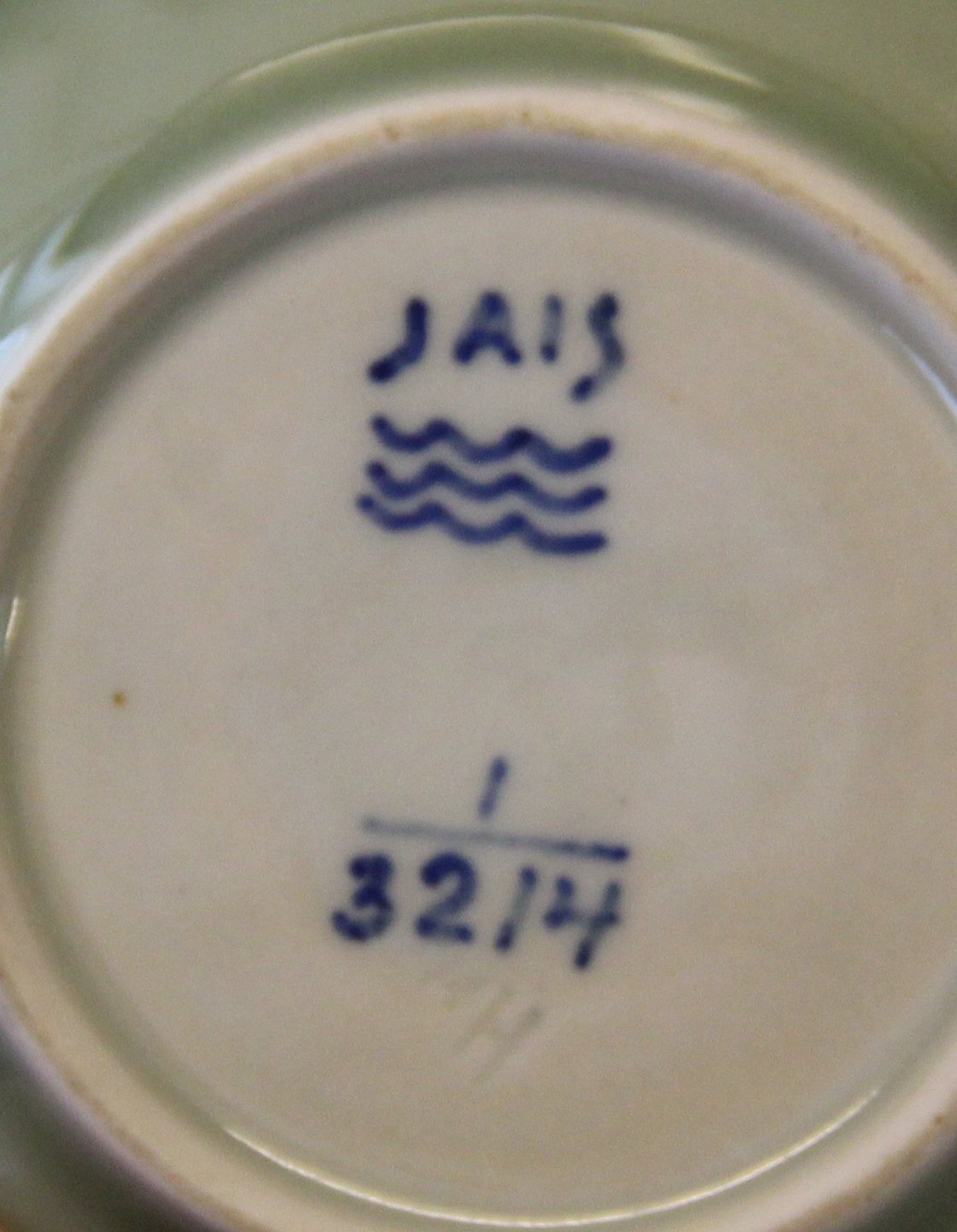 3214-1 Kgl. Signeret Jais Nielsen Celadon glaseret skål med logo; Den Kongelige Porcelænsfabrik 11 cm