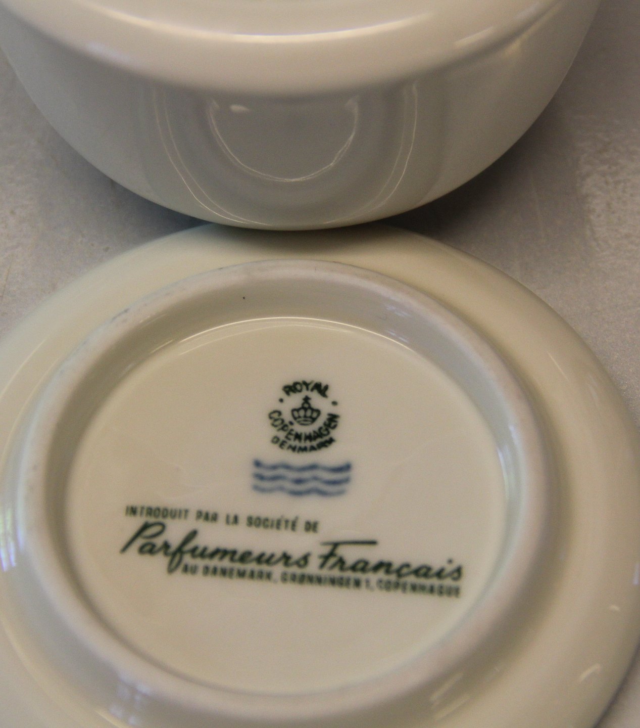 Kongelig Dansk Stentøj RC Gellè Frerés Paris 8 x 10 cm Parfume Lågkrukke: På låg Paris og dansende putti Design Nils Thorsson