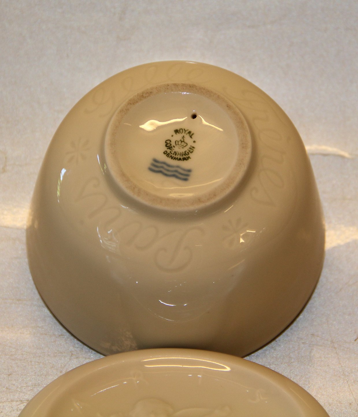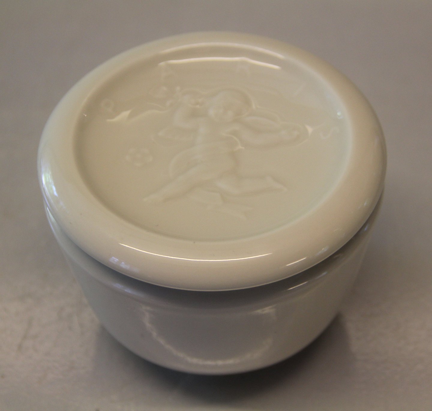 Beskrivelse: Royal Copenhagen stentøj RC Gellè Frerés Paris 8 x 10 cm Lågkrukke På låg Paris og dansende putti Design Nils Thorsson Gelle Freres