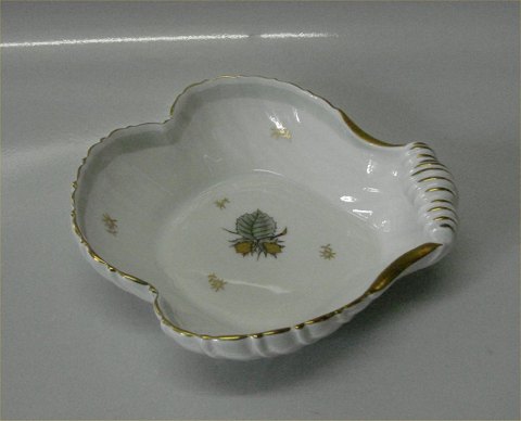 042 Muslingeskål 17 cm Hasselnød Bing & Grøndahl B&G : Hvidt porcelæn, hasselnødder i guld, grønne blade, grønt bånd og guldkant, form 601 Helsingør I fin og hel stand. Hazelnut - Haselnuss