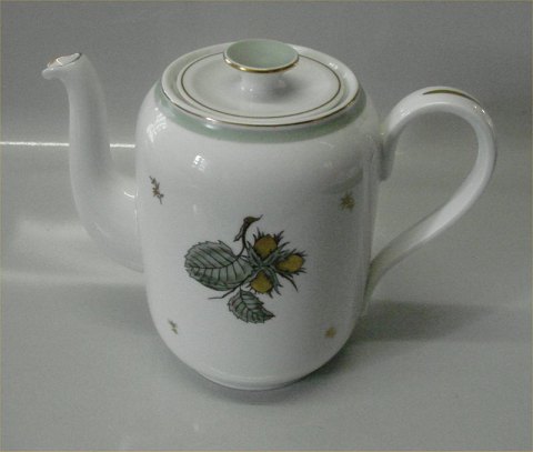 091 a Kaffekande 19 cm 1 l (301) Hasselnød Bing & Grøndahl B&G : Hvidt porcelæn, hasselnødder i guld, grønne blade, grønt bånd og guldkant, form 601 Helsingør I fin og hel stand. Hazelnut - Haselnuss