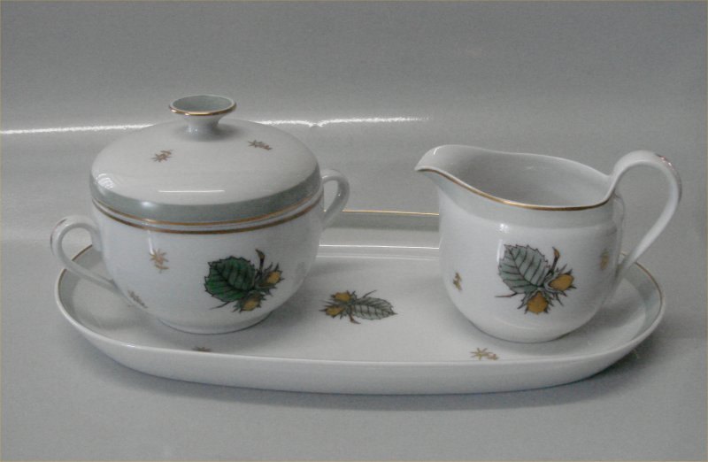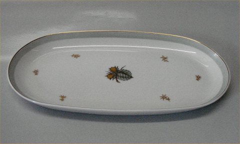 096 Bakke, aflang 27 x 15 cm (364) Hasselnød Bing & Grøndahl B&G : Hvidt porcelæn, hasselnødder i guld, grønne blade, grønt bånd og guldkant, form 601 Helsingør I fin og hel stand. Hazelnut - Haselnuss