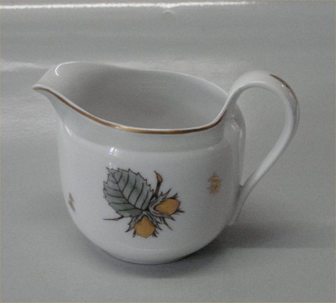 189 Flødekande 10,5 cm 2,25 dl Hasselnød Bing & Grøndahl B&G : Hvidt porcelæn, hasselnødder i guld, grønne blade, grønt bånd og guldkant, form 601 Helsingør I fin og hel stand. Hazelnut - Haselnuss