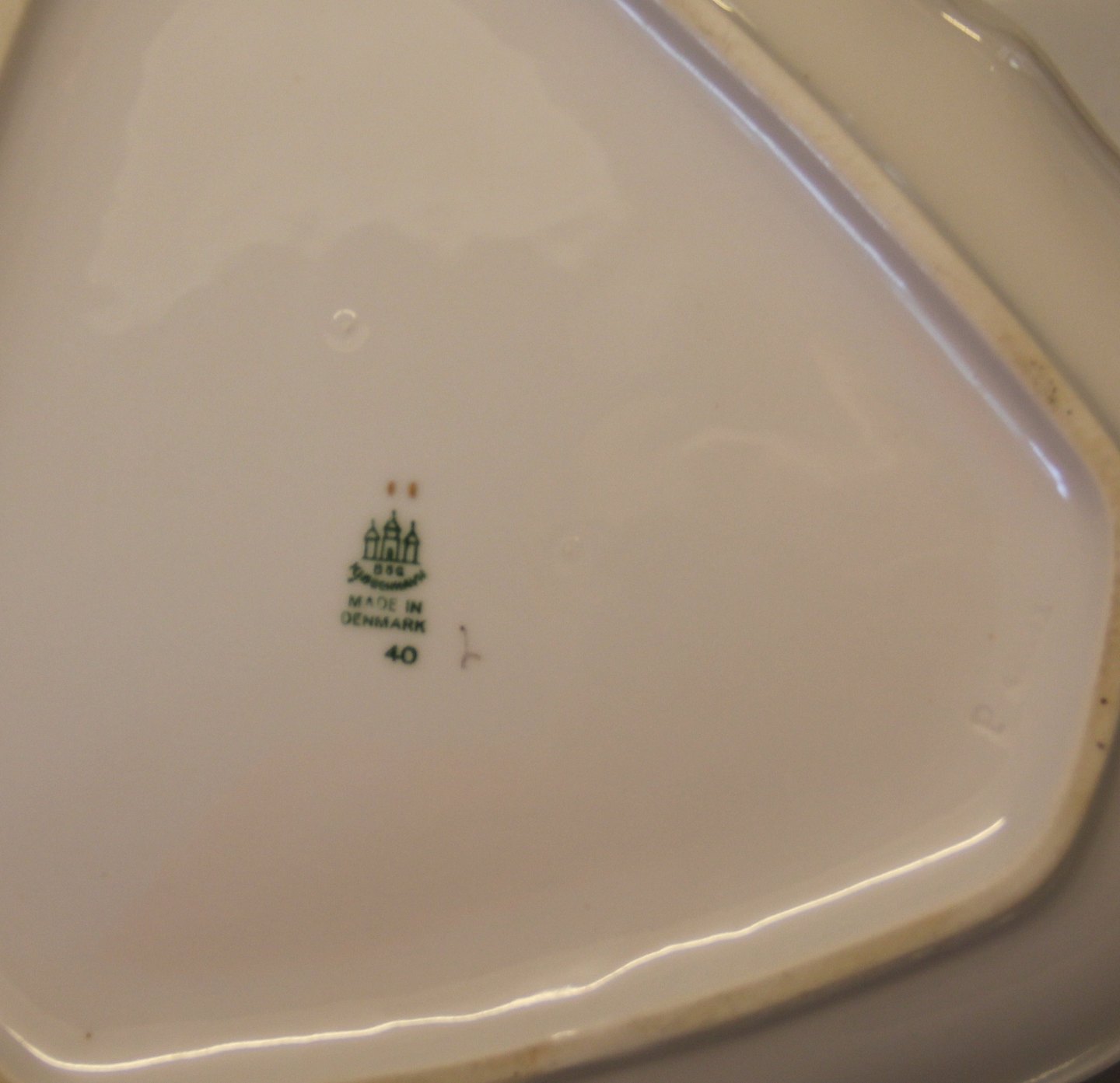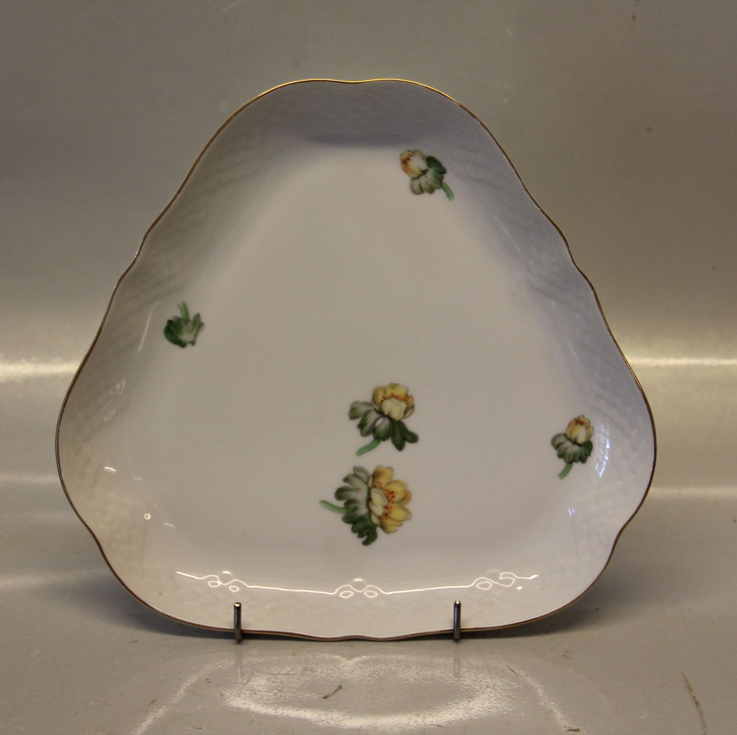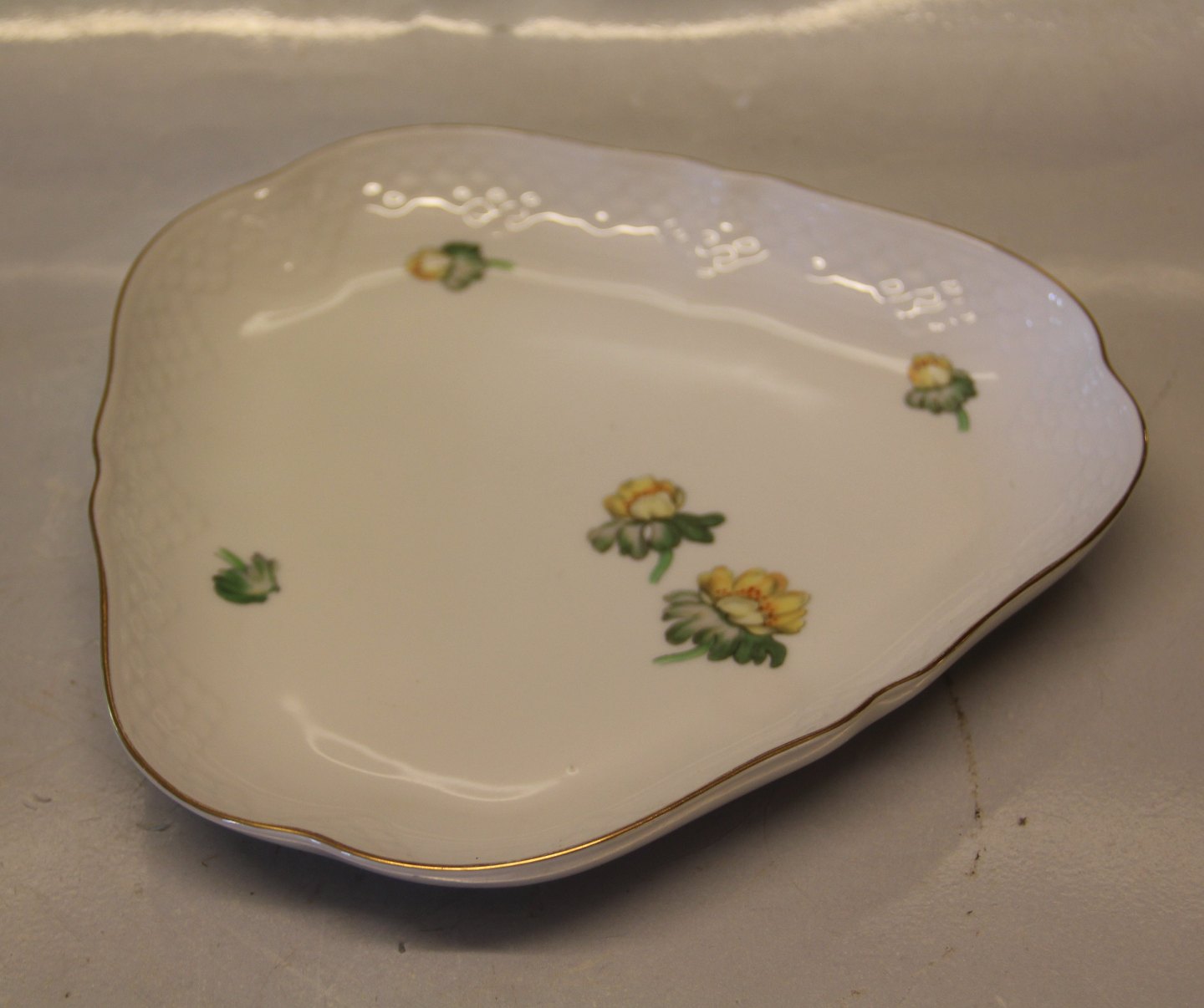040 Trekantet fad 25 cm (354) Bing & Grøndahl Erantis blomster på hvidt porcelæn med guldkant I fin og hel stand