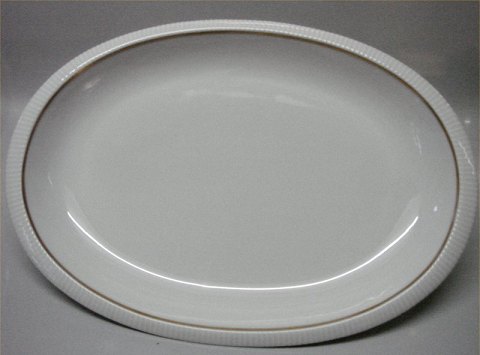 015 Stort ovalt stegefad 40 cm (315) Vega B&G med smal guldbelægning på inderkanten . Form 674 er formgivet af Sigward Bernadotte. Denne form findes i hvidt, med bred guldkant (Gylden Sol), med grønt og guld (Perseus), med rødt og guld (Herkules) og beige og guld (Norma).