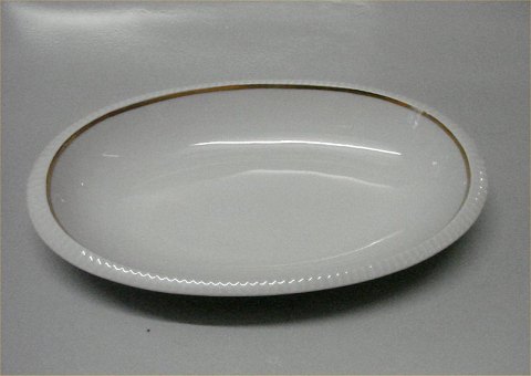 039 Oval kageskål 23 cm (314) Vega B&G med smal guldbelægning på inderkanten . Form 674 er formgivet af Sigward Bernadotte. Denne form findes i hvidt, med bred guldkant (Gylden Sol), med grønt og guld (Perseus), med rødt og guld (Herkules) og beige og guld (Norma).