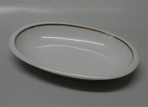 038 Ovalt kagefad 18,5 cm (349) Vega B&G med smal guldbelægning på inderkanten . Form 674 er formgivet af Sigward Bernadotte. Denne form findes i hvidt, med bred guldkant (Gylden Sol), med grønt og guld (Perseus), med rødt og guld (Herkules) og beige og guld (Norma).
