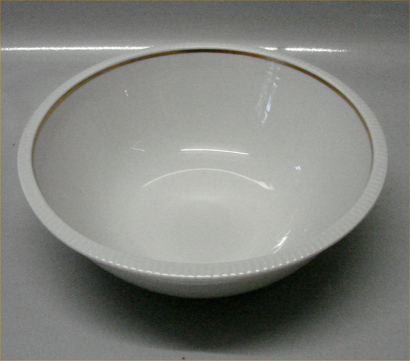 043 Stor kartoffelskål, rund 23,5 x 8,5 cm (313) Vega B&G med smal guldbelægning på inderkanten . Form 674 er formgivet af Sigward Bernadotte. Denne form findes i hvidt, med bred guldkant (Gylden Sol), med grønt og guld (Perseus), med rødt og guld (Herkules) og beige og guld (Norma).