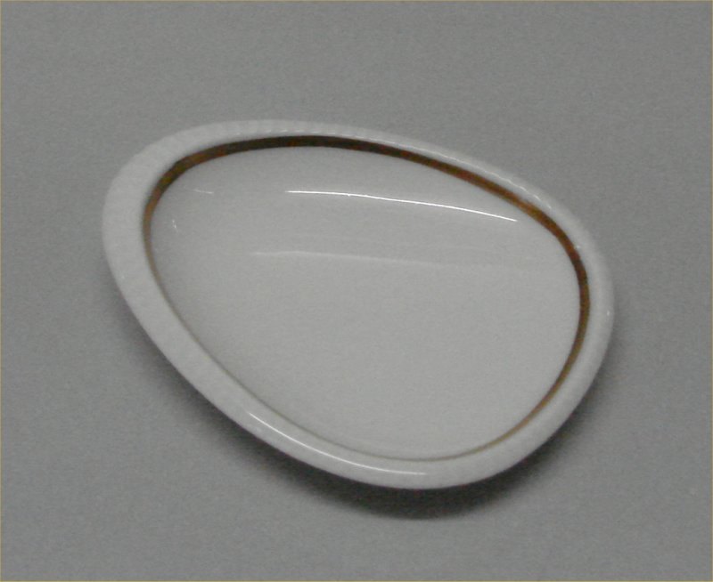200 Kuvert smør 8,5 cm (330) Vega B&G med smal guldbelægning på inderkanten . Form 674 er formgivet af Sigward Bernadotte. Denne form findes i hvidt, med bred guldkant (Gylden Sol), med grønt og guld (Perseus), med rødt og guld (Herkules) og beige og guld (Norma).
