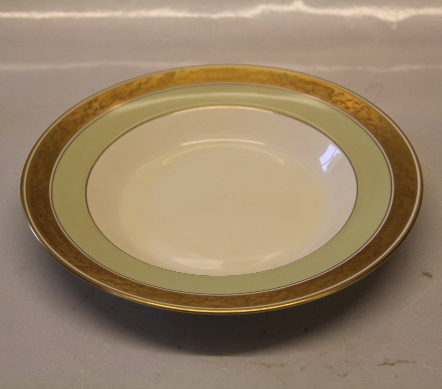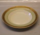 9590-988 Tallerken, dyb 22 cm Dagmar spise- og kaffestel fra Den kongelige Porcelænsfabrik. Grønt porcelæn med bred guldkant med ciseleret relief af stiliserede planter og krone. I fin og hel stand Design Thorkild Olsen 1938