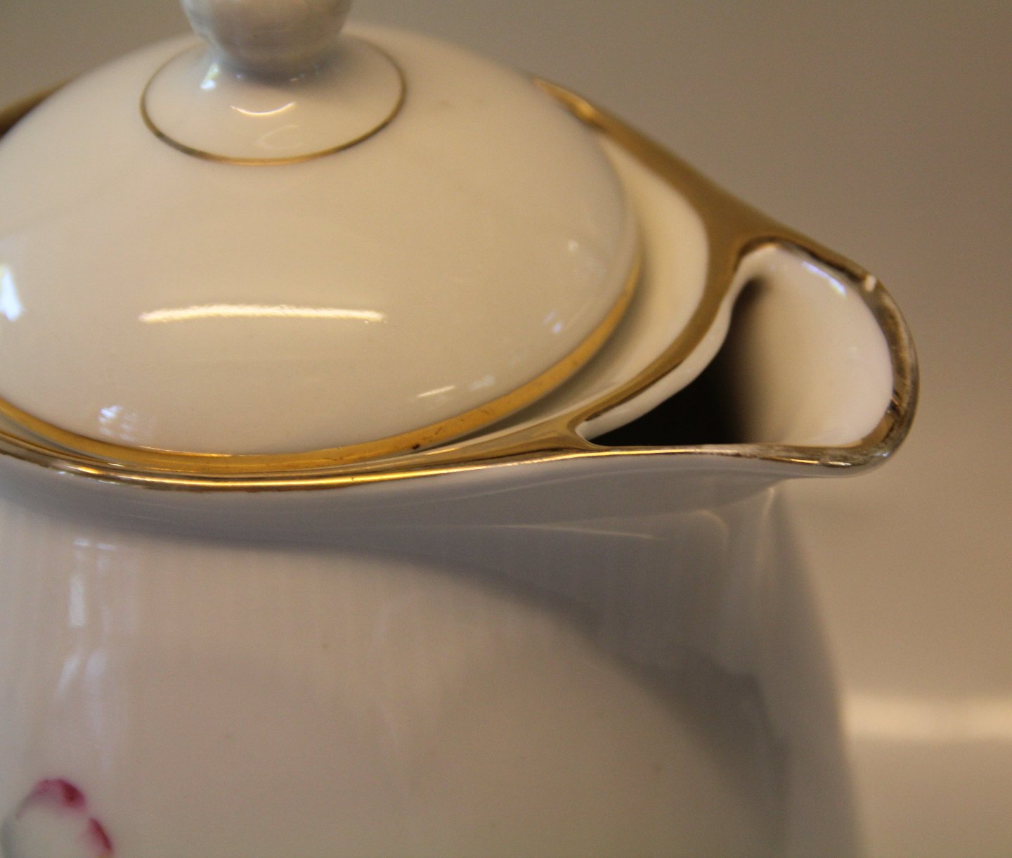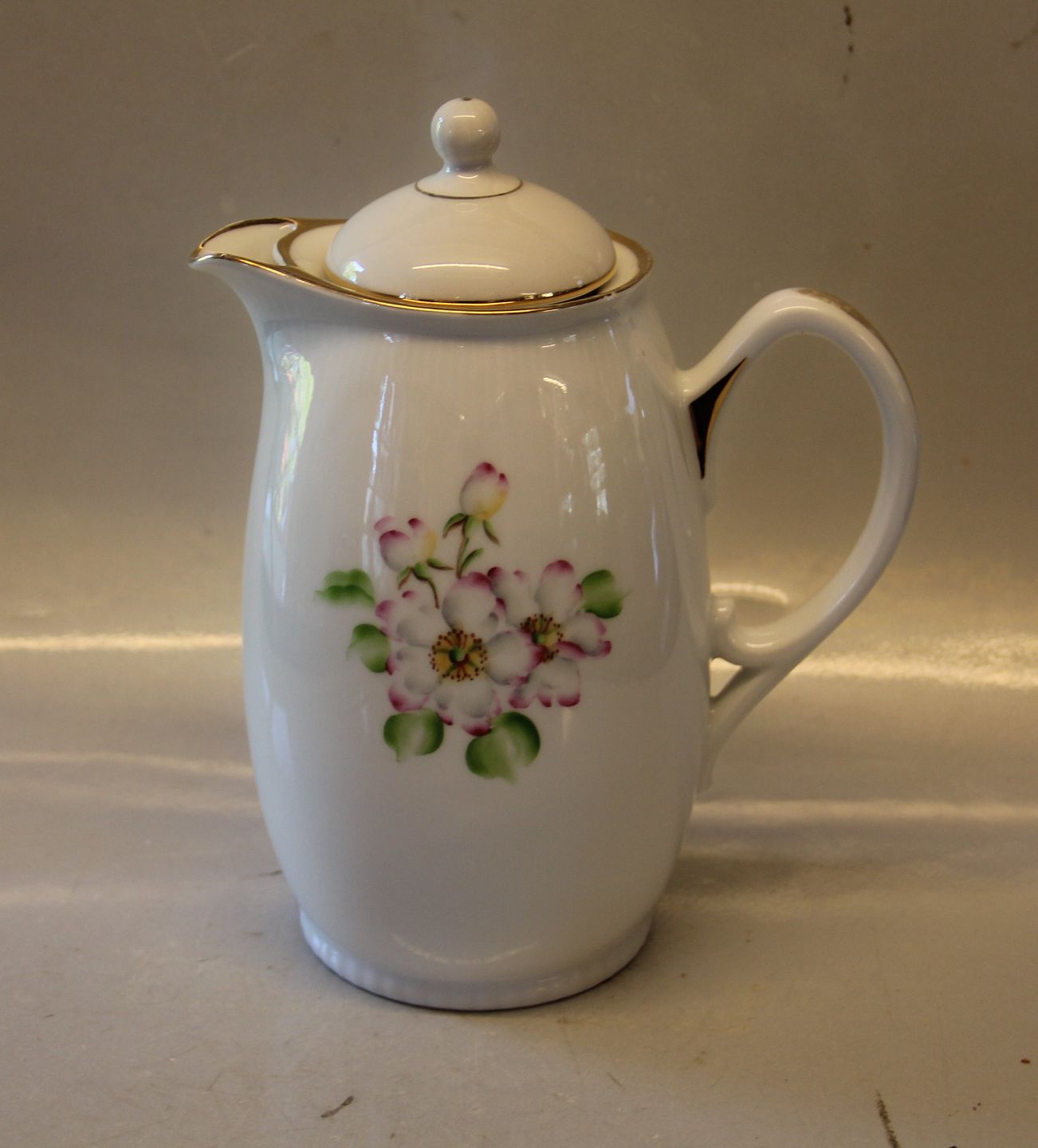 081 Chokoladekande med låg 1,25 l (444) ca 25 cm Bing & Grøndahl Princesse Margrethe - Hvidt riflet porcelæn, æbleblomst og glansguld, form 505 polerguld, form 130. Slid på guld