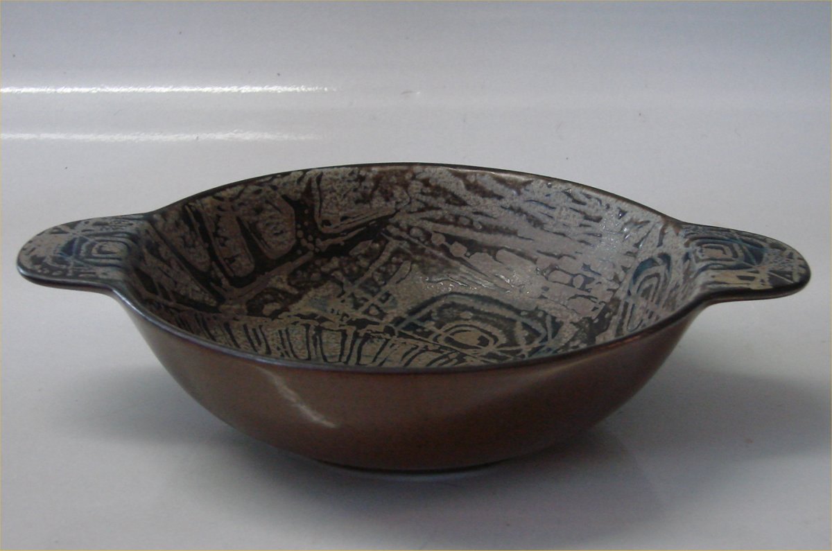 Beskrivelse: Royal Copenhagen Aluminia Baca fajance 870-3122 Brun skål med øre 21 cm Nils Thorsson Baca, Aluminia