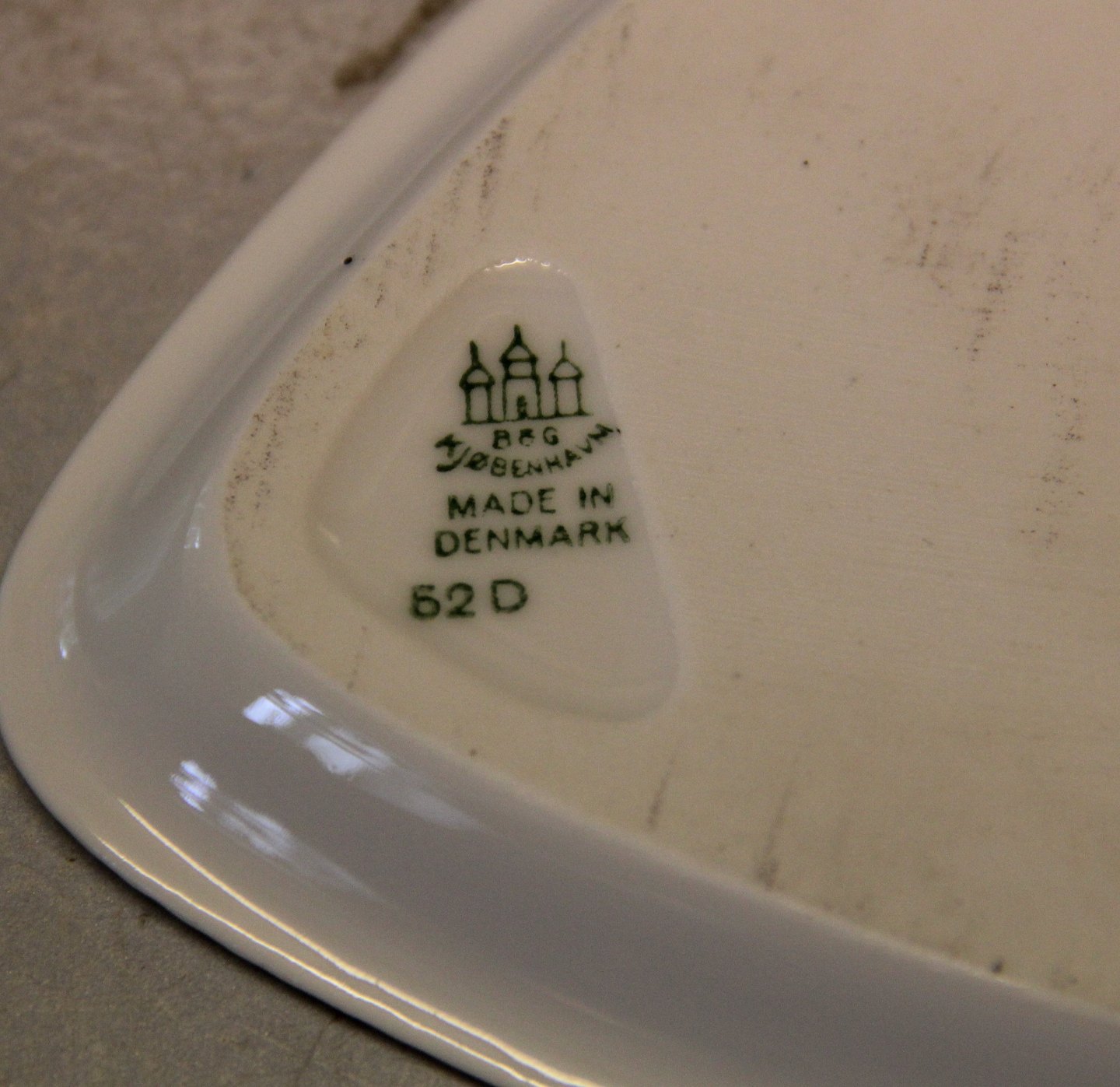 052 d Trekantet bakke, plat de menage 14 cm (361) Vega B&G med smal guldbelægning på inderkanten . Form 674 er formgivet af Sigward Bernadotte. Denne form findes i hvidt, med bred guldkant (Gylden Sol), med grønt og guld (Perseus), med rødt og guld (Herkules) og beige og guld (Norma).