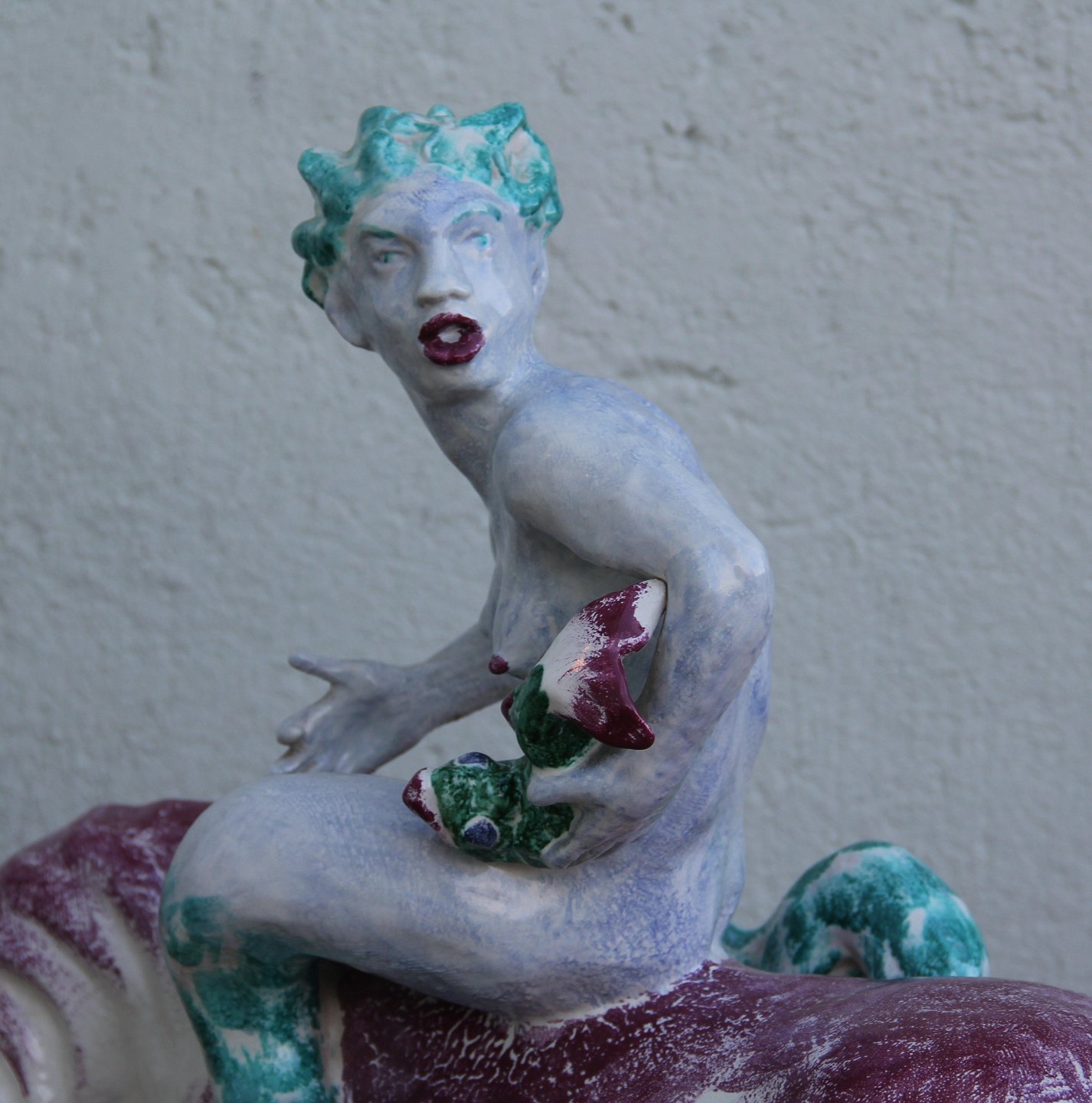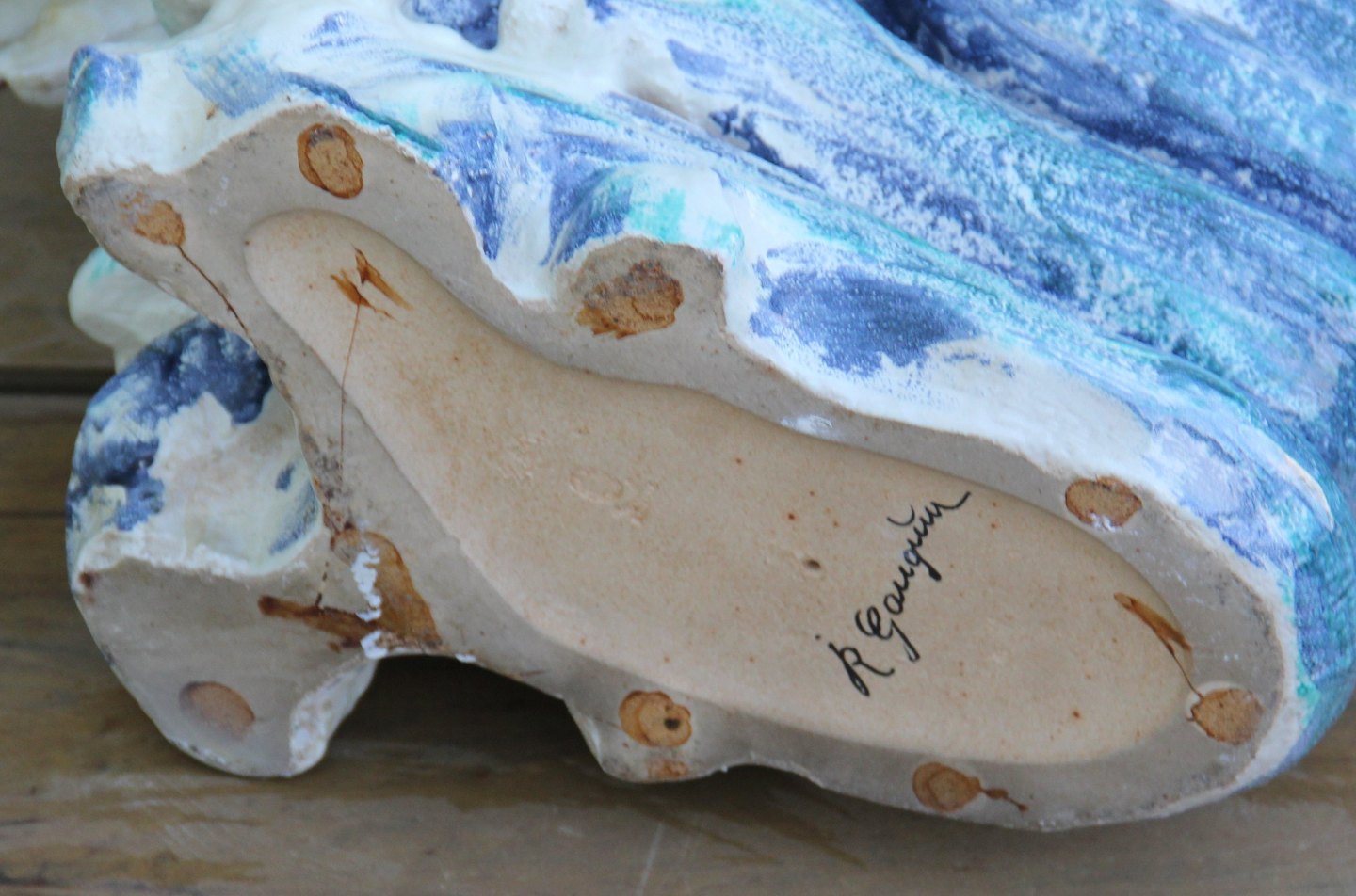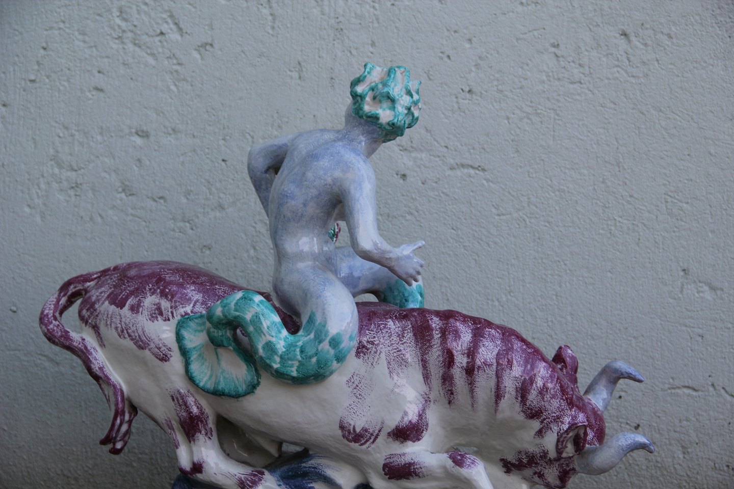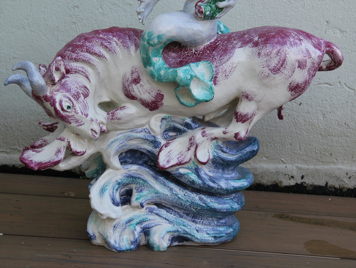 Bing & Grøndahl J. R. Gauguin: Figurgruppe af polykromt glaseret roche céramique / fajanace Havfrue ridende på "Hav" Tyr ca 65 cm høj