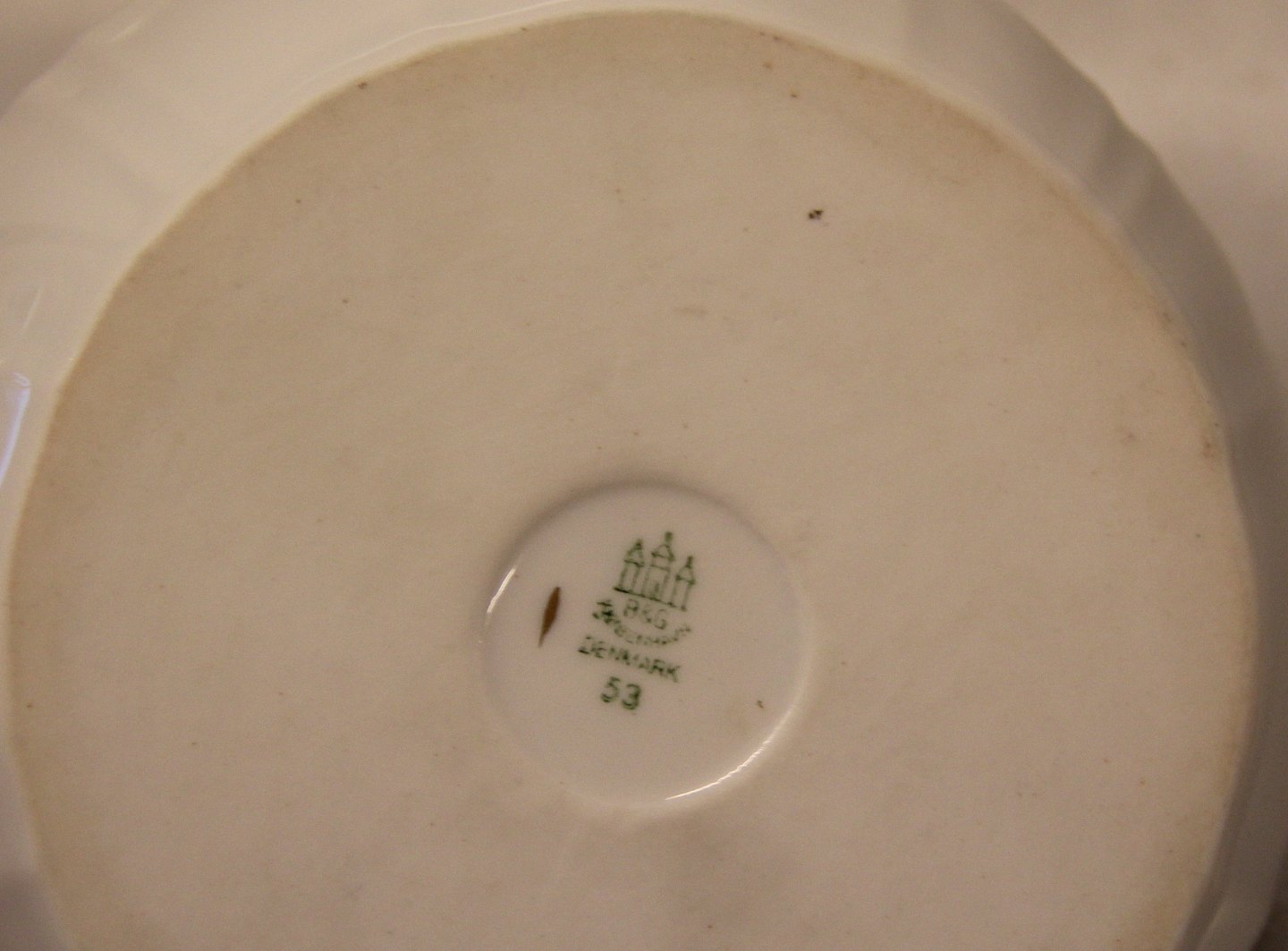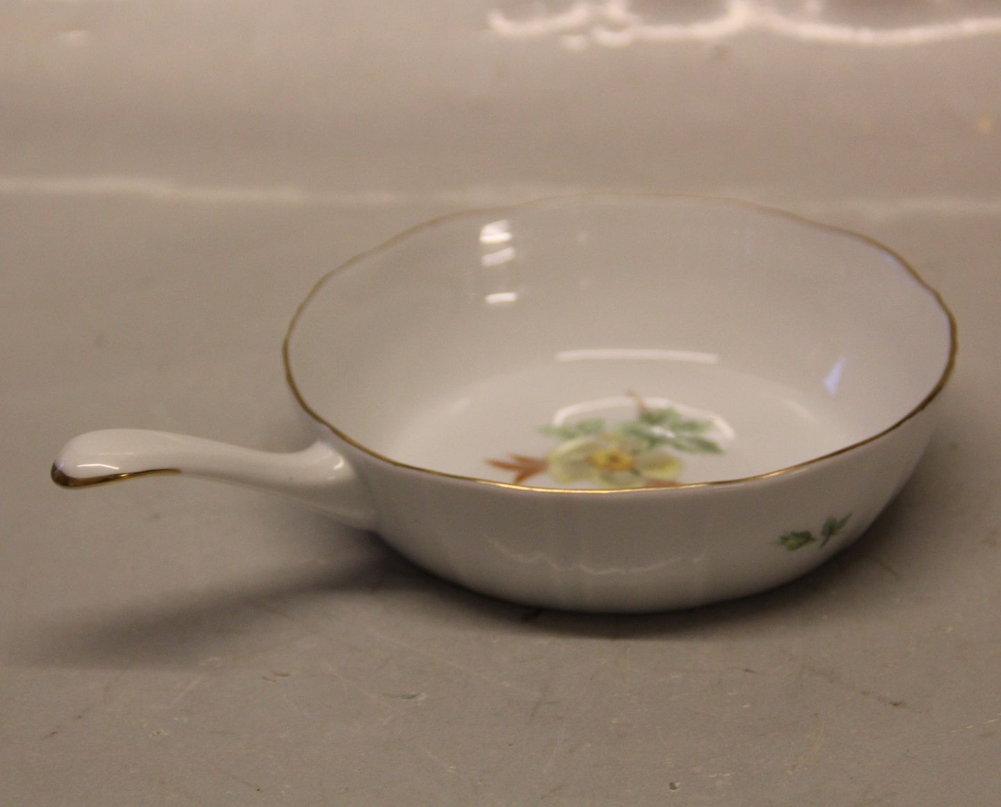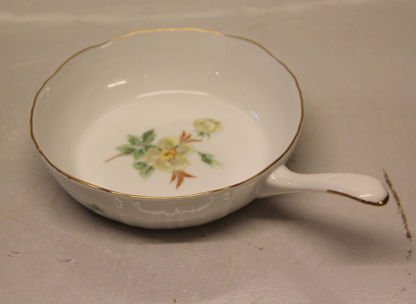 053 Spejlægspande 3.5 x dia 14 cm (med hank 20.5 cm) Bing & Grøndahl Klitrose Hvidt kantet porcelæn med bred guldkant og klitrose (Hyber - Scotch Rose). Bing & Groendahl I hel og fin stand
