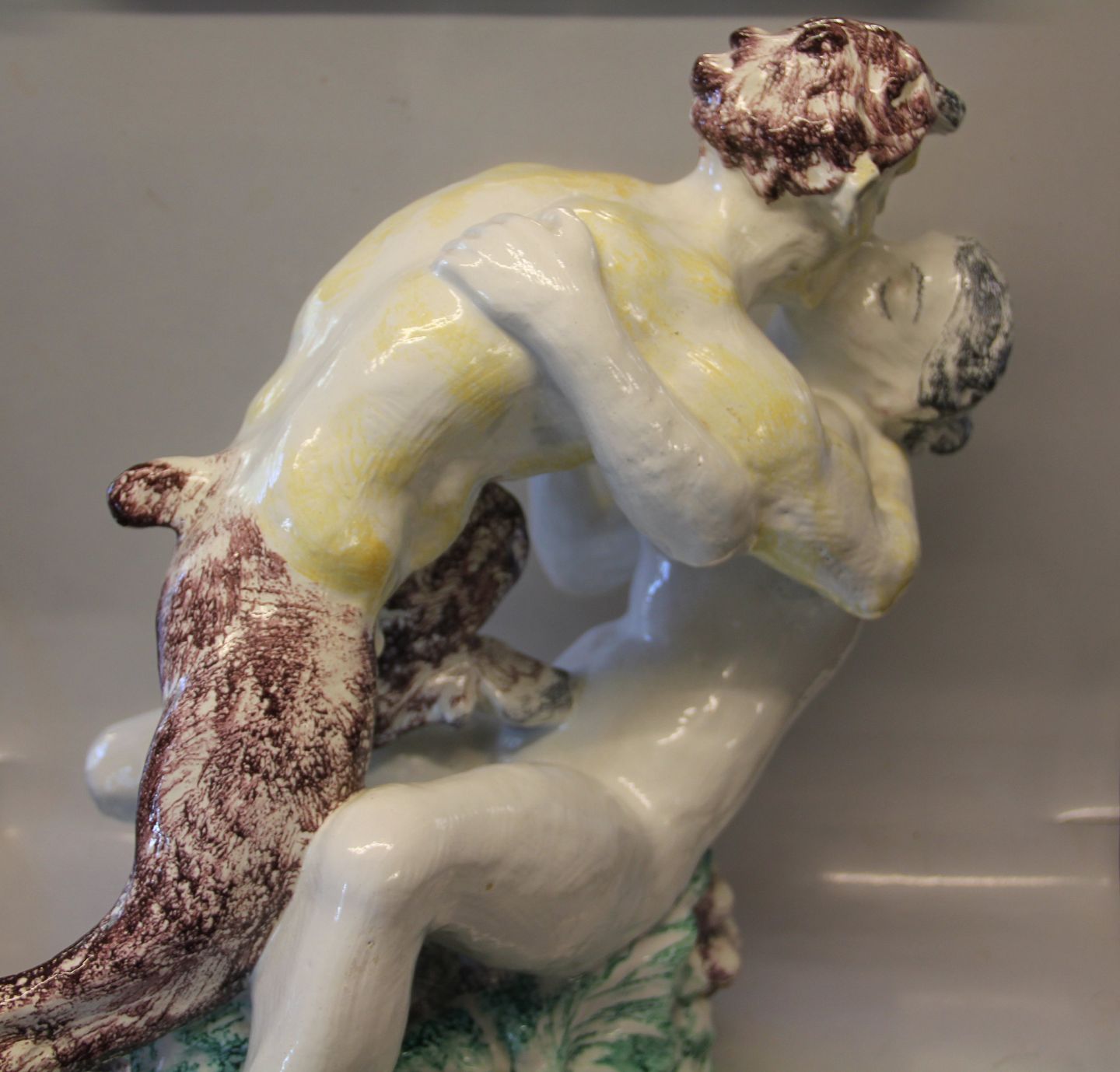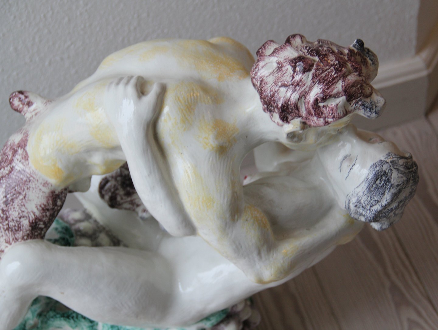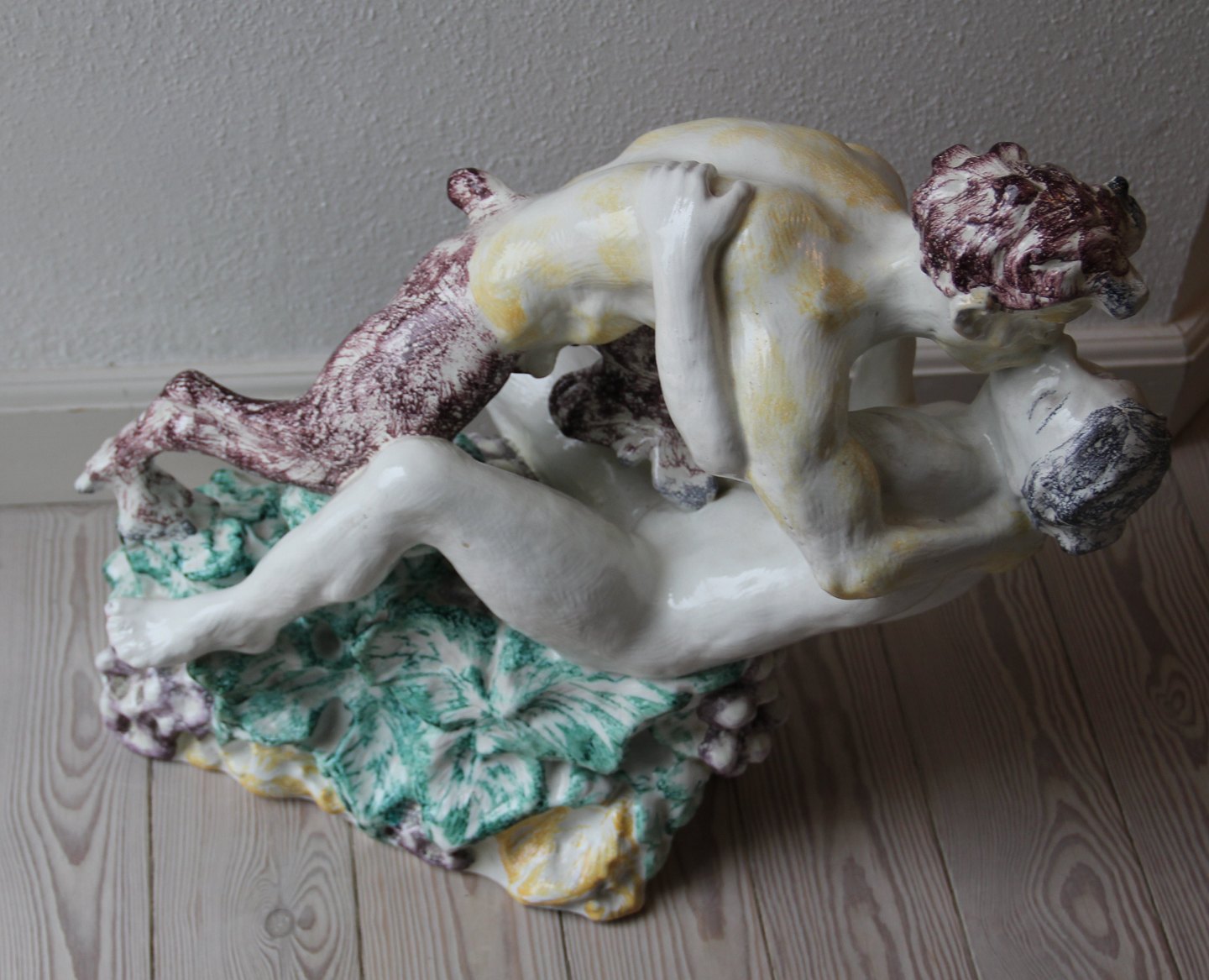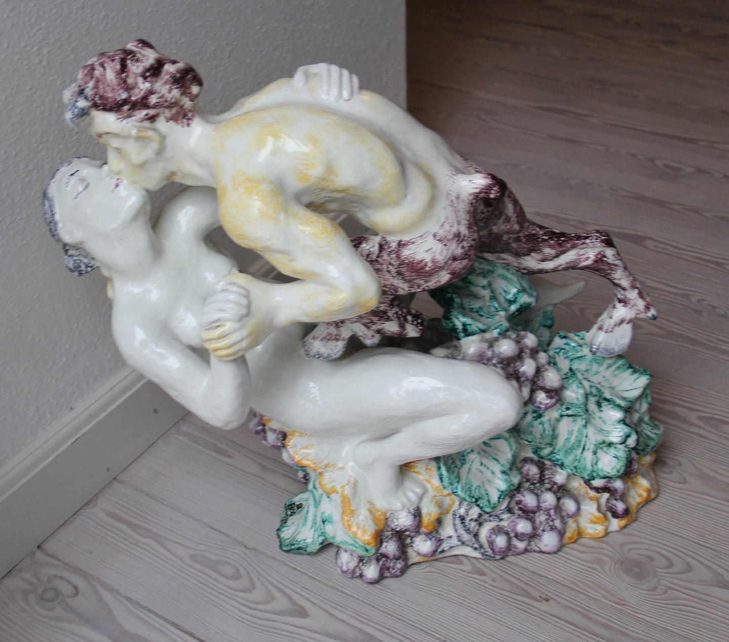 B&G "Kysset" Bing & Grøndahl Jean René Gauguin: "Silen" - Vingud kysser nøgen kvinde i vingaarden Figurgruppe af polykromt glaseret roche céramique / fajance . Sign. R. Gauguin Begrænset oplag nr 14 af 50 I fin og hel stand ca 48 x 60 cm
