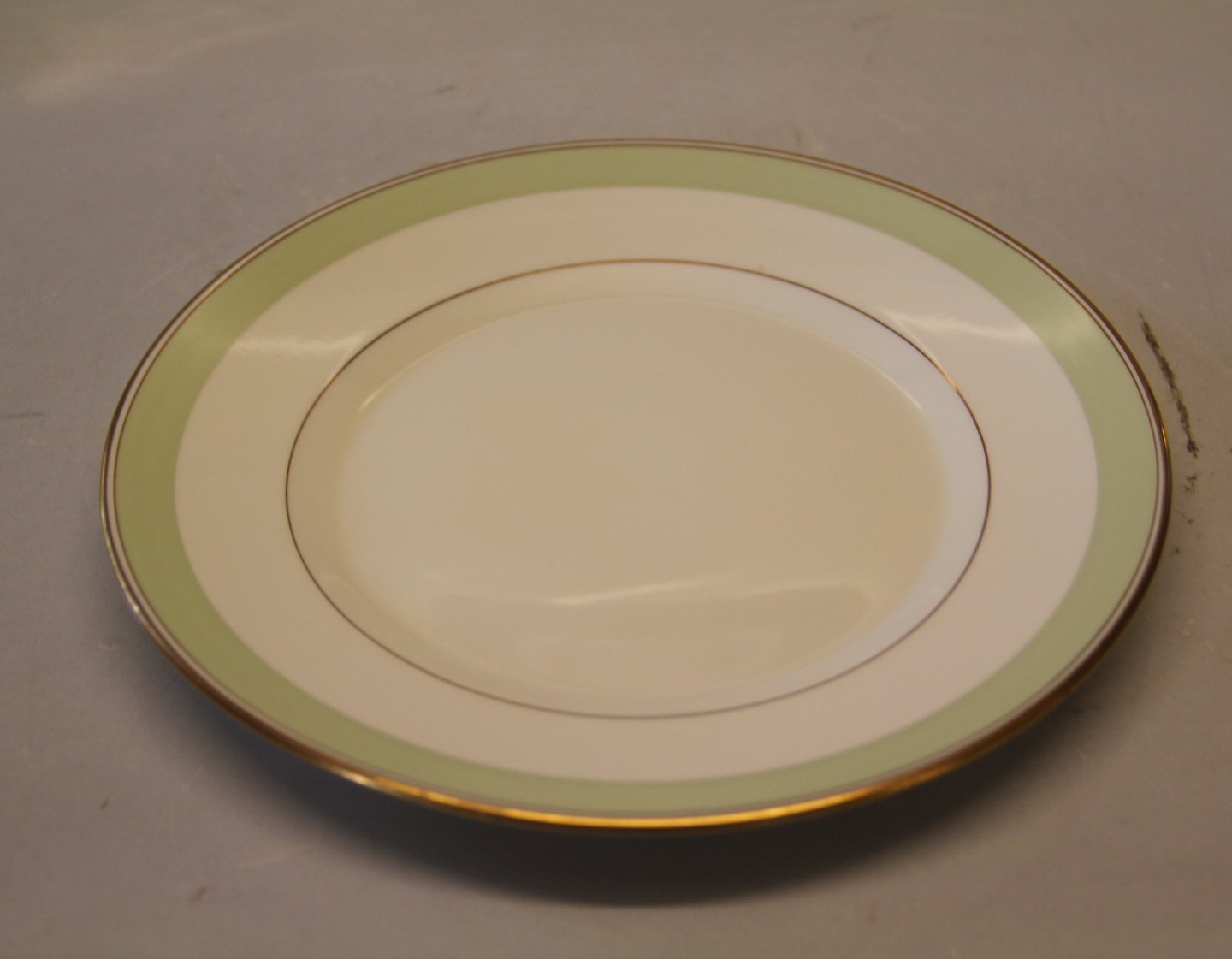 9589-1236 Tallerken, flad 22 cm Broager #1236 Kongelig porcelæn Kgl. spise- og kaffestel fra Den kongelige Porcelænsfabrik Grøn på creme porcelæn med guldkant. Af Torkild Olsen TO som også skabte Dagmar