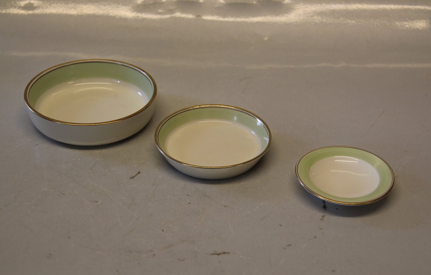 Broager #1236 Kongelig porcelæn Kgl. spise- og kaffestel fra Den kongelige Porcelænsfabrik Grøn på creme porcelæn med guldkant. Af Torkild Olsen TO som også skabte Dagmar