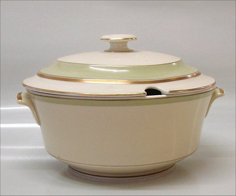 9576-1236 Terrin, rund 2 l Broager #1236 Kongelig porcelæn Kgl. spise- og kaffestel fra Den kongelige Porcelænsfabrik Grøn på creme porcelæn med guldkant. Af Torkild Olsen TO som også skabte Dagmar