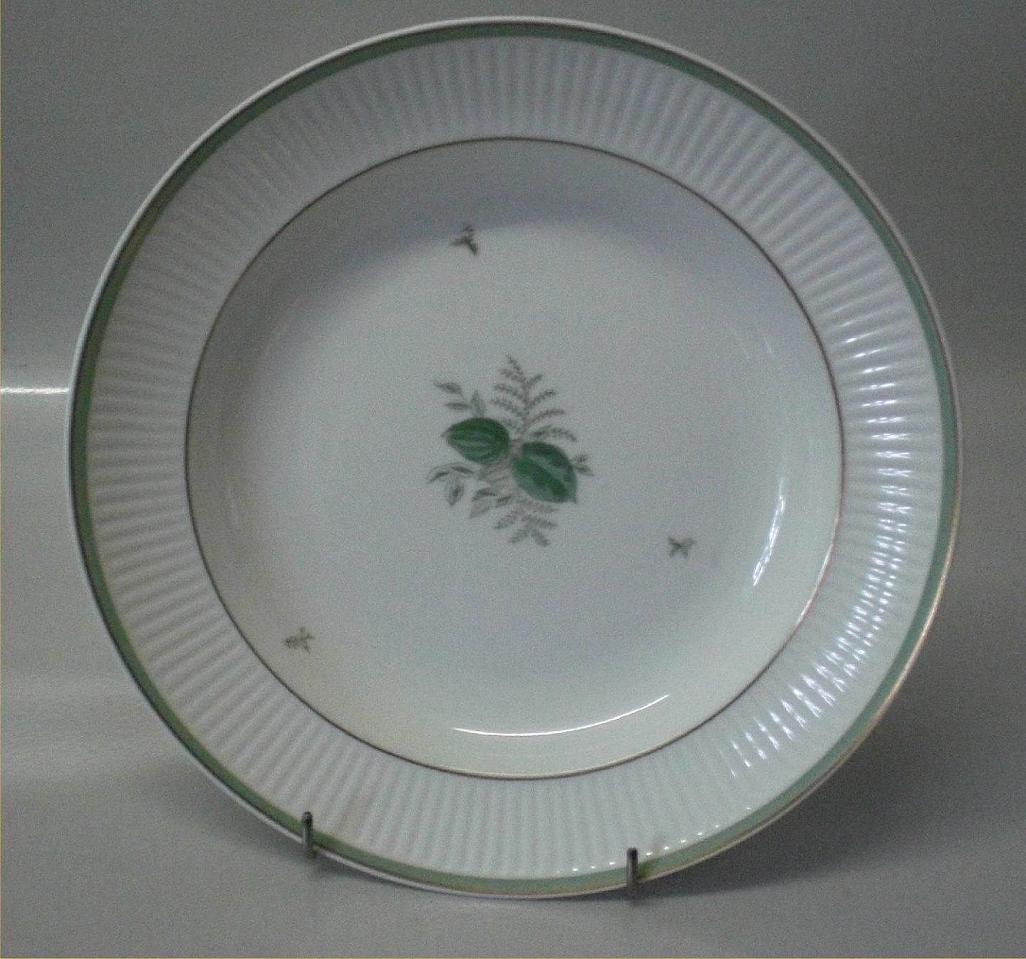 1513-14062 Dyb tallerken 23 cm Grøn Melodi #1513 (Kgl.) Rillet form, hvid glasur, grøn dekoration, grønt båd og guldfilet.