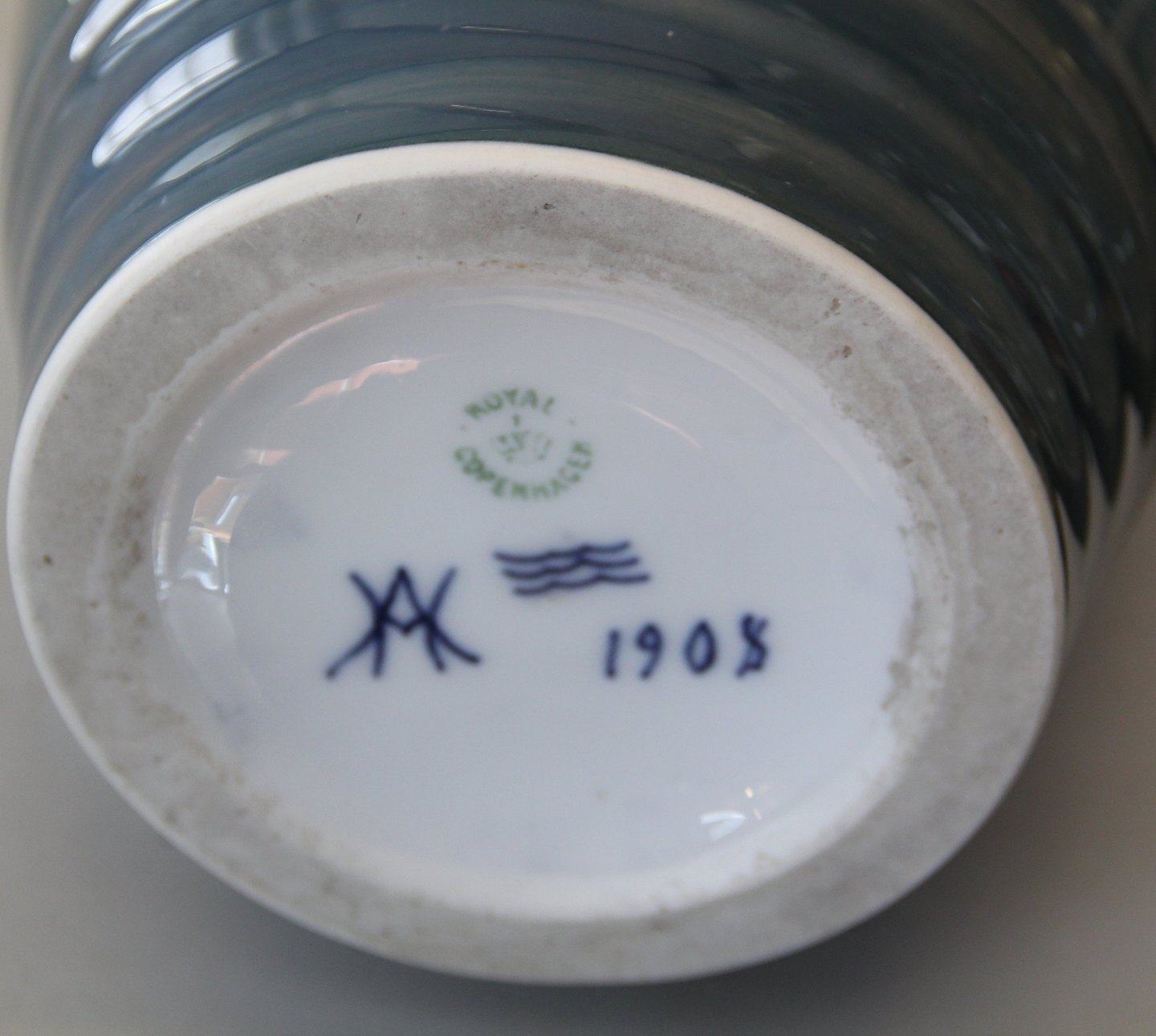 Beskrivelse: Art nouveau 354 Kgl Vase 42 cm Blå Iris ved vandkanten Signeret i Monogram AM? 1908 fra Royal Copenhagen I hel og fin stand