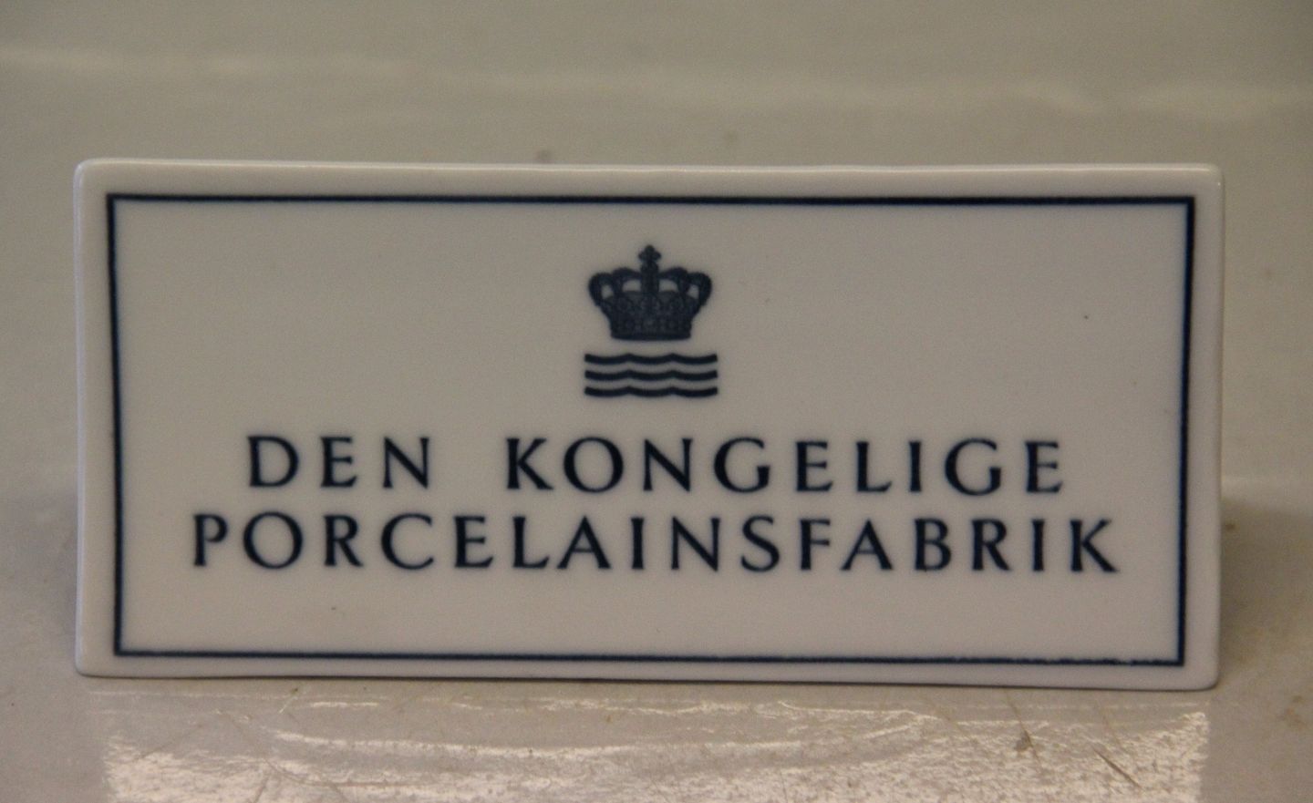 Beskrivelse: Kgl. Forhandlerskilt til bord eller hylde 6.5 x 14 cm Den Kongelige Porcelainsfabrik fra Royal Copenhagen I hel og fin stand